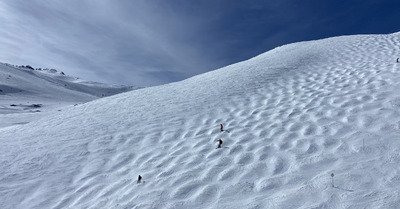Tellement de neige que le télécabine ouvre seulement à 10h20, je suis dans la deuxième benne. Première descente, premières traces, c'est presque pas possible tellement il y en a, il faut se mettre droit dans la pente, et trouver bcp de pente. Dès que la vitesse flanche, le matos coule dans la poudreuse et se retrouve sous plus d'un mètre de neige. Les autres descentes sont meilleures, en croisant d'autres traces, on garde plus de vitesse.