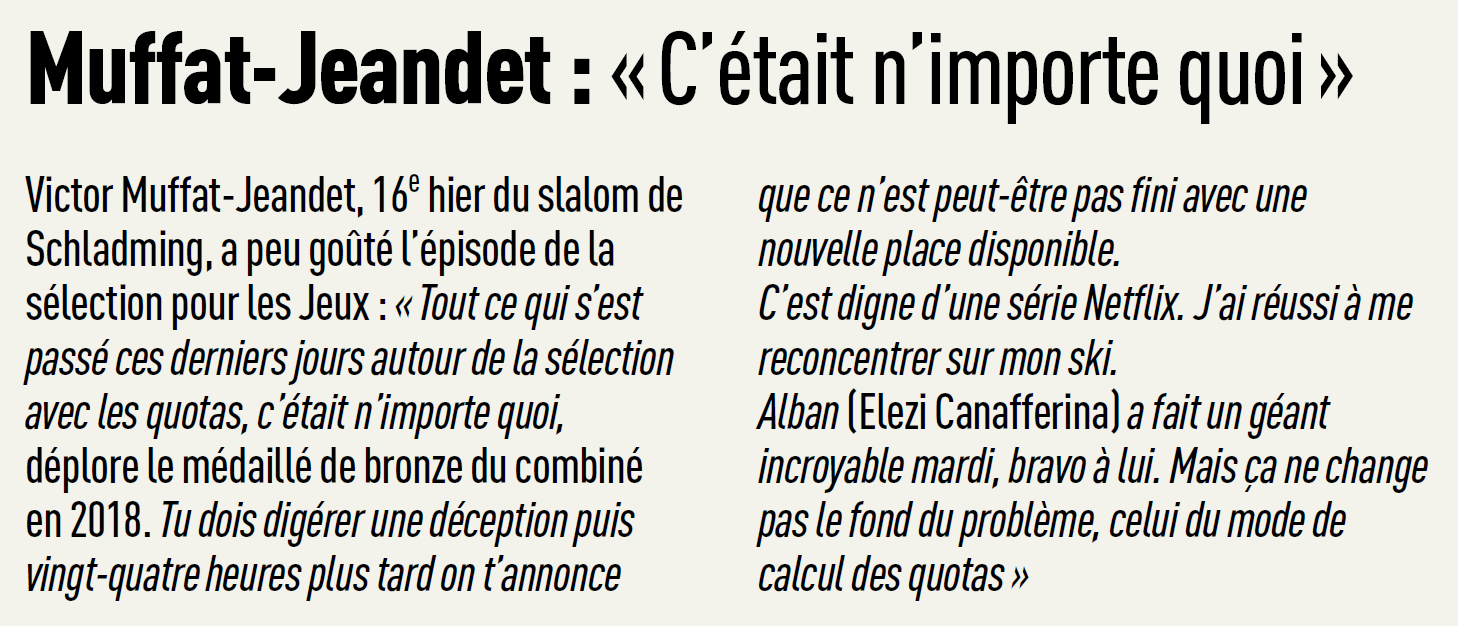 "Quelle est votre analyse sur le gros sujet du moment, les quotas pour les JO ? La France ne pourra aligner que sept skieurs à Bormio (liste communiquée ce lundi), dont vous. Est-ce logique ?