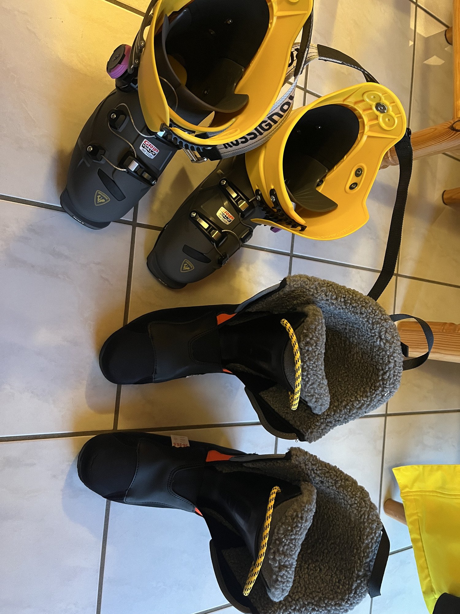 Chaussures reçues, premiers essais au sec effectués, et réglage de skis (vieilles fixations non-gripwalk, il va falloir changer tout ça