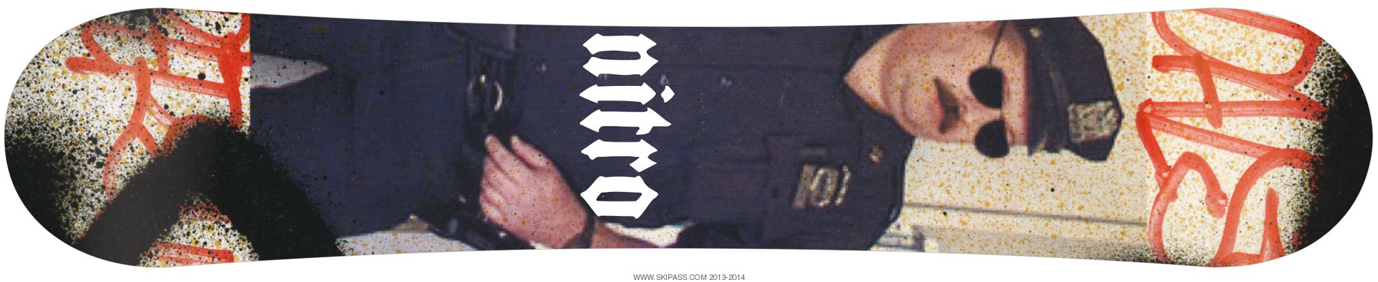 ?L'idée pour mon premier graphisme sur la Pro one-off est venue du défi constant que l'on rencontre lorsqu'on fait notre boulot de snowboarder pro, qui est de ruser sans cesse pour déjouer les flics. Ce graphisme montre ce que j'en suis sûr est la peur de beaucoup de flics, une arme. Ainsi quand vous ridez cette board, elle vous écarte des problèmes avec la police, utilisez vos talents pour les avoir.?