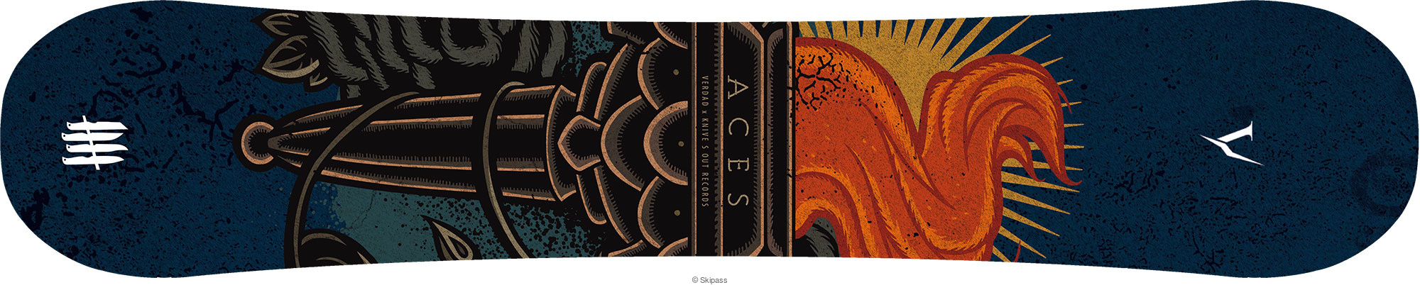 Dans notre monde, nous sommes convaincu que Verdad porte le flambeau de l'authenticité du mouvement « Snowlife ». C'est pourquoi nous travaillons dur pour nous assurer que le -V- prospère et ne sera jamais oublié. Le résultat? La Aces est une véritable arme destinée à régner sur le Freestyle All Mountain et sur les pistes. La Aces est une board très performante au caractère authentique qui se destine aux riders confirmés et pros. Le design est signé par le tumultueux artiste français Johan Marie, de Knive's out Records.