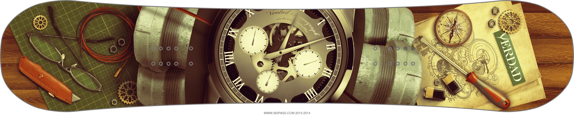 Tic tac, tic tac... Le temps ne cesse de faire son travail en dirigeant le monde et nos vies. Nous sommes tous impuissants face à lui. Voilà l'idée principale cachée derrière la déco de cette planche. En snowboard, ce concept s'applique aussi, nous cherchons tous à optimiser notre temps pour rider le plus possible en une journée. Le matin, un coup d'oeil jeté à ton réveil ou à ta montre te dit qu'il est l'heure d'aller rider. Au cours de la journée, les aiguilles t'indiquent aussi ...