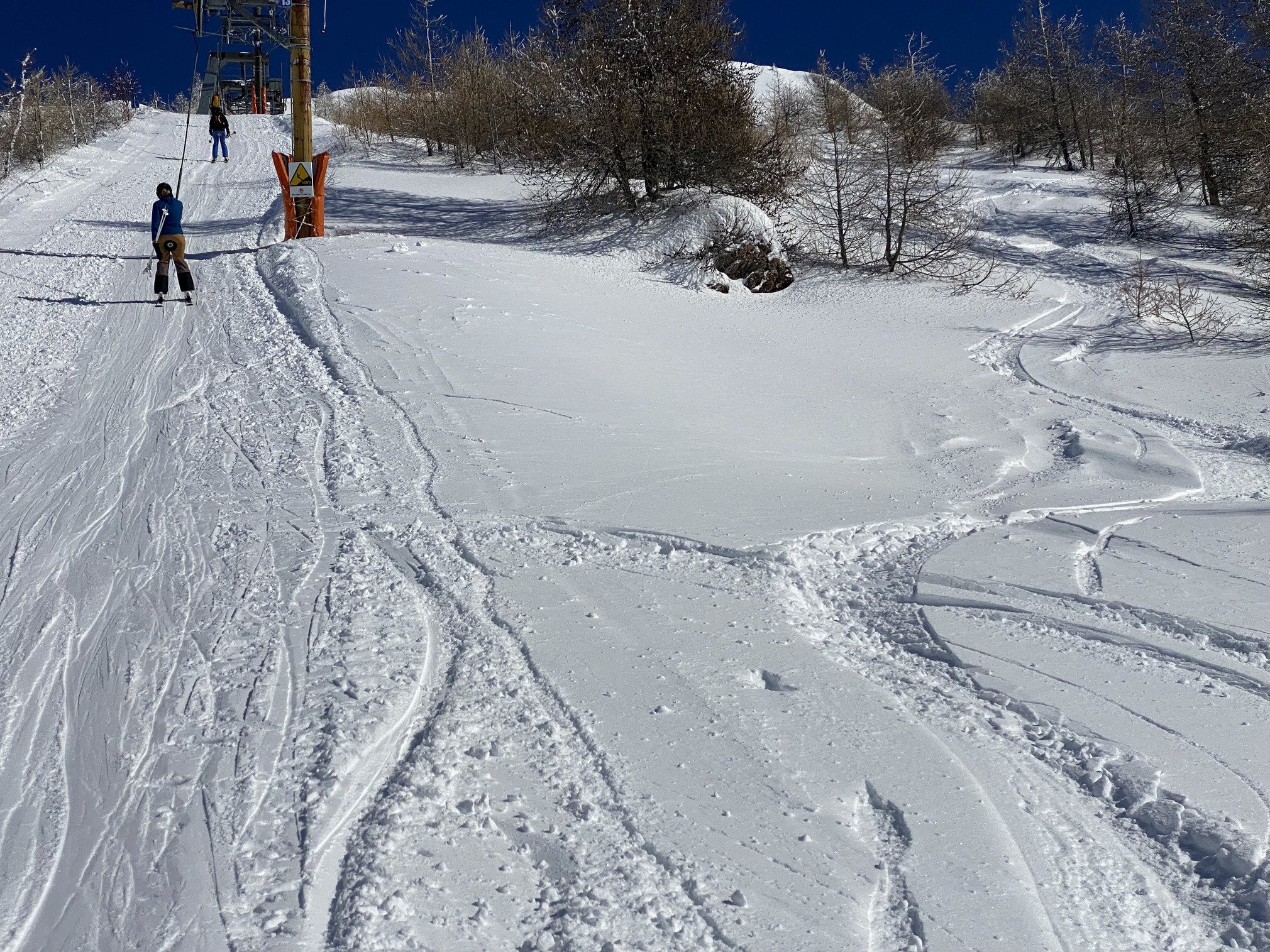 La qualité de la neige évolue fortement tout au long de la journée, notamment du fait des températures en forte hausse. Alors autant la neige est restée incroyablement froide toute la journée sur les secteurs guère exposés au soleil (le secteur valpreveyre toujours aussi pépite et d’autant plus depuis que ce TK de la brume nous ramène si facilement sur le domaine au dessus d’abries) , autant la longue piste bleue plein sud qui rentre au bas de la station se dégrade très vite à partir de 14h et devient bien moins praticable notamment pour les débutants.