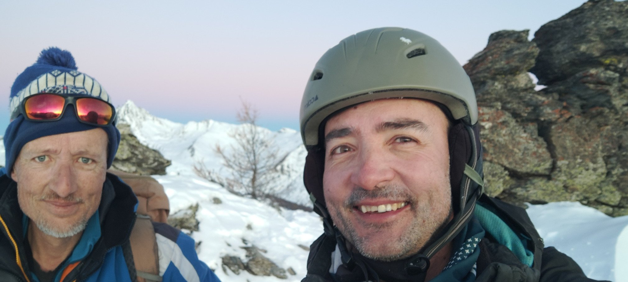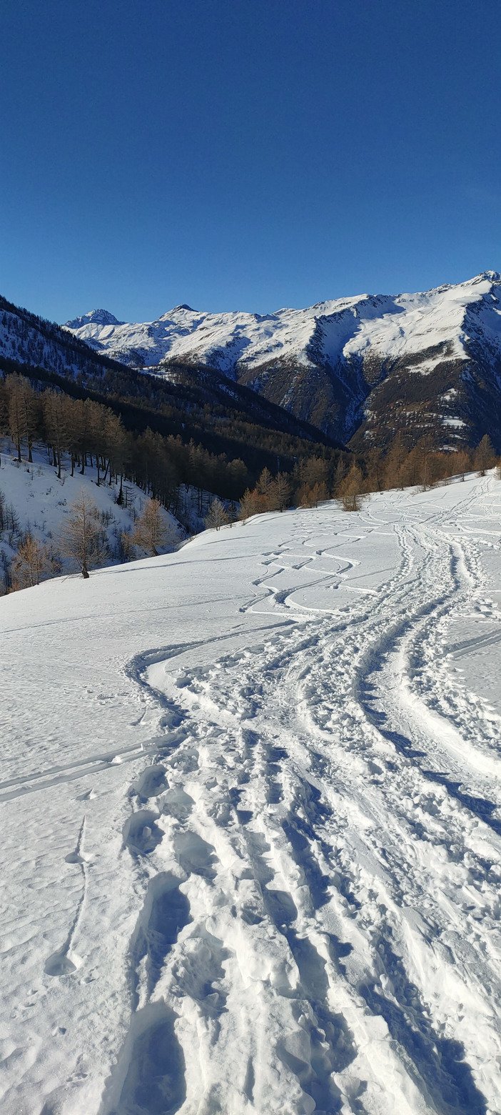 Après avoir profité des magnifiques couleurs du coucher de soleil, on attaque la descente vers 17h 😱, en direction de Ristolas (soit à gauche en descendant, alors que le domaine skiable est à droite). Jusque vers 2000 m, en choisissant les bonnes orientations, on continue à profiter d'une poudreuse délicieuse, et encore pas trop tracée. En dessous, c'est malheureusement une croûte 4 étoiles, où il faut quasiment faire du virage sauté pour avoir une chance de faire pivoter les talons 🥴. Forcément, ça prend du temps, surtout que l'enneigement commence à être limite sur le bas. Pas mal de section en "mixte" neige / touffes d'herbe, mais ça passe, sans dommages pour les semelles.