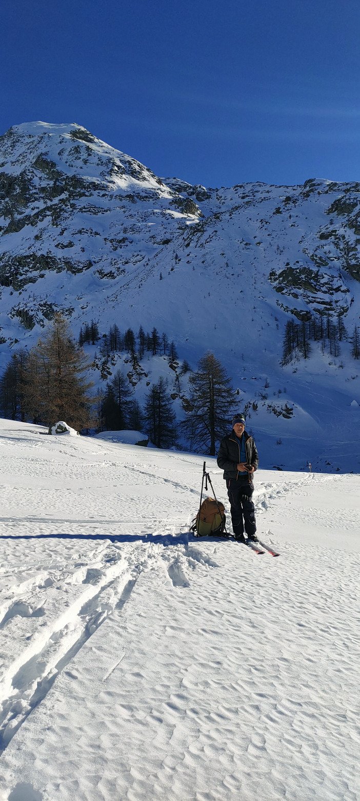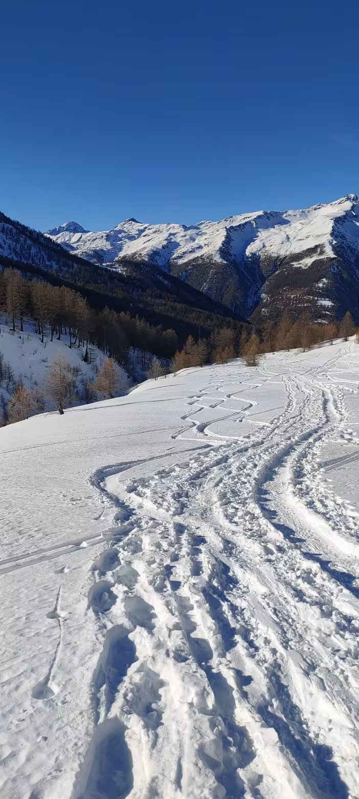 L'après midi, on enclenche le mode freeride rando. Direction Valpreveyre, avec une petite session "ski de rando nordique". On se met en mode marche, mais sans les peaux, pour une vingtaine de minutes de balade jusqu'à choper le vallon au pied du Bric Bouchet. Certes, il y a des traces, mais encore des sections vierges, et la poudreuse est absolument parfaite : 30-40 cm tassée, on skie littéralement dans la ouate, c'est trop bon 😄