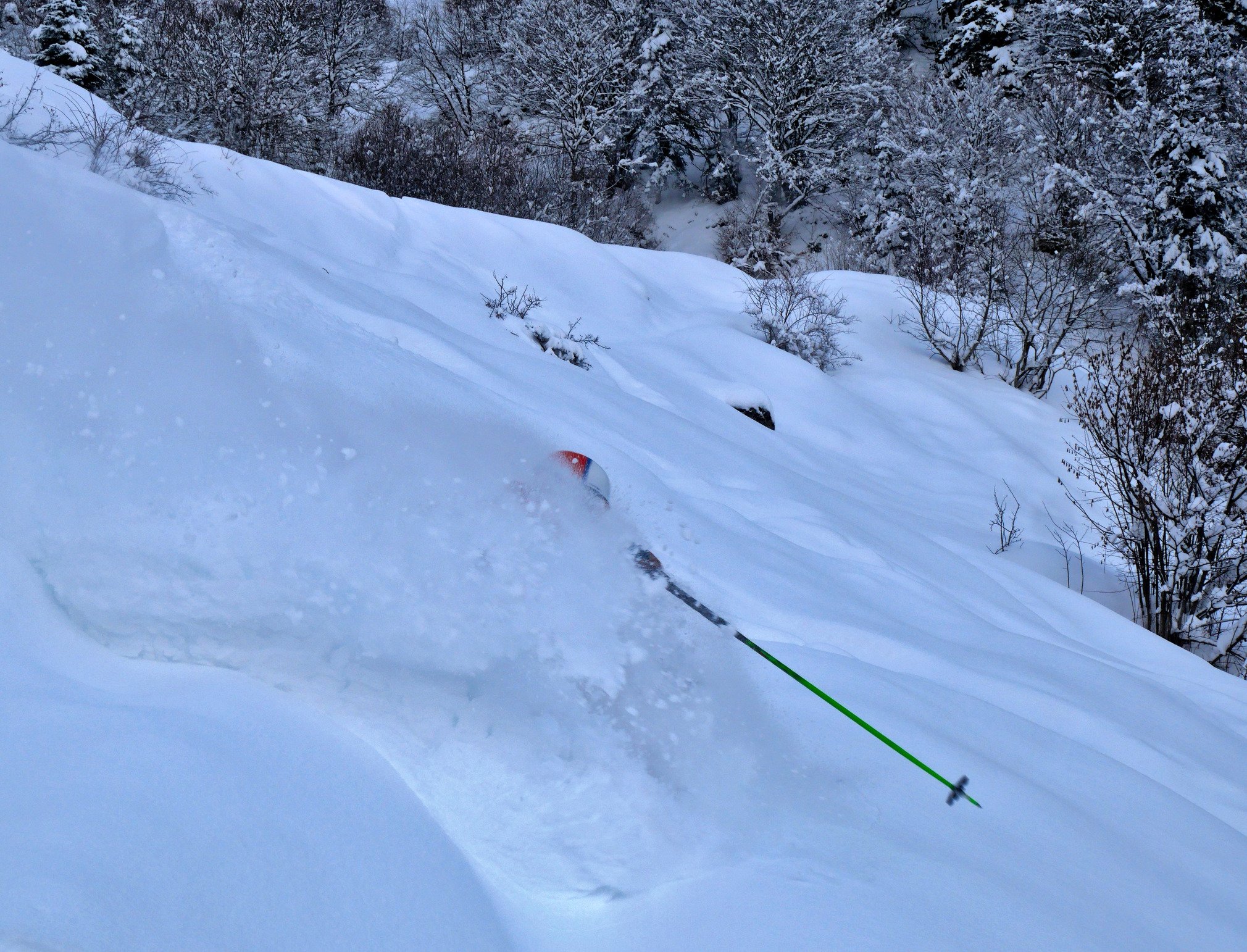 Fin de matinée, nous tournions dans le seul secteur légèrement arboré avec une neige bien agréable. Nous avions aussi l'avantage d'être protégé de ce vent Sud-Ouest forcissant et puis à l'heure du repas, le plafond est bien redescendu et les flocons sont réapparus.