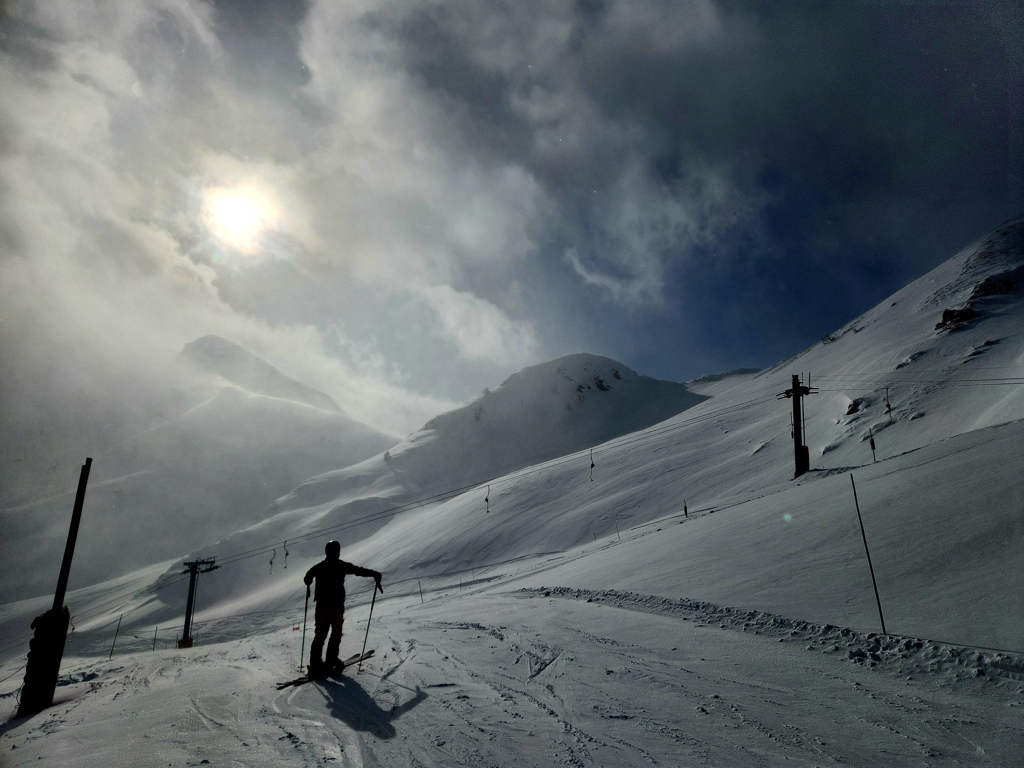 Après avoir perdu 45 mn pendant la fenêtre méteo matinale, nous avons profité de quelques bons virages avec des éclaircies ne durant pas plus que le temps d'arriver en haut de l'unique télésiège.