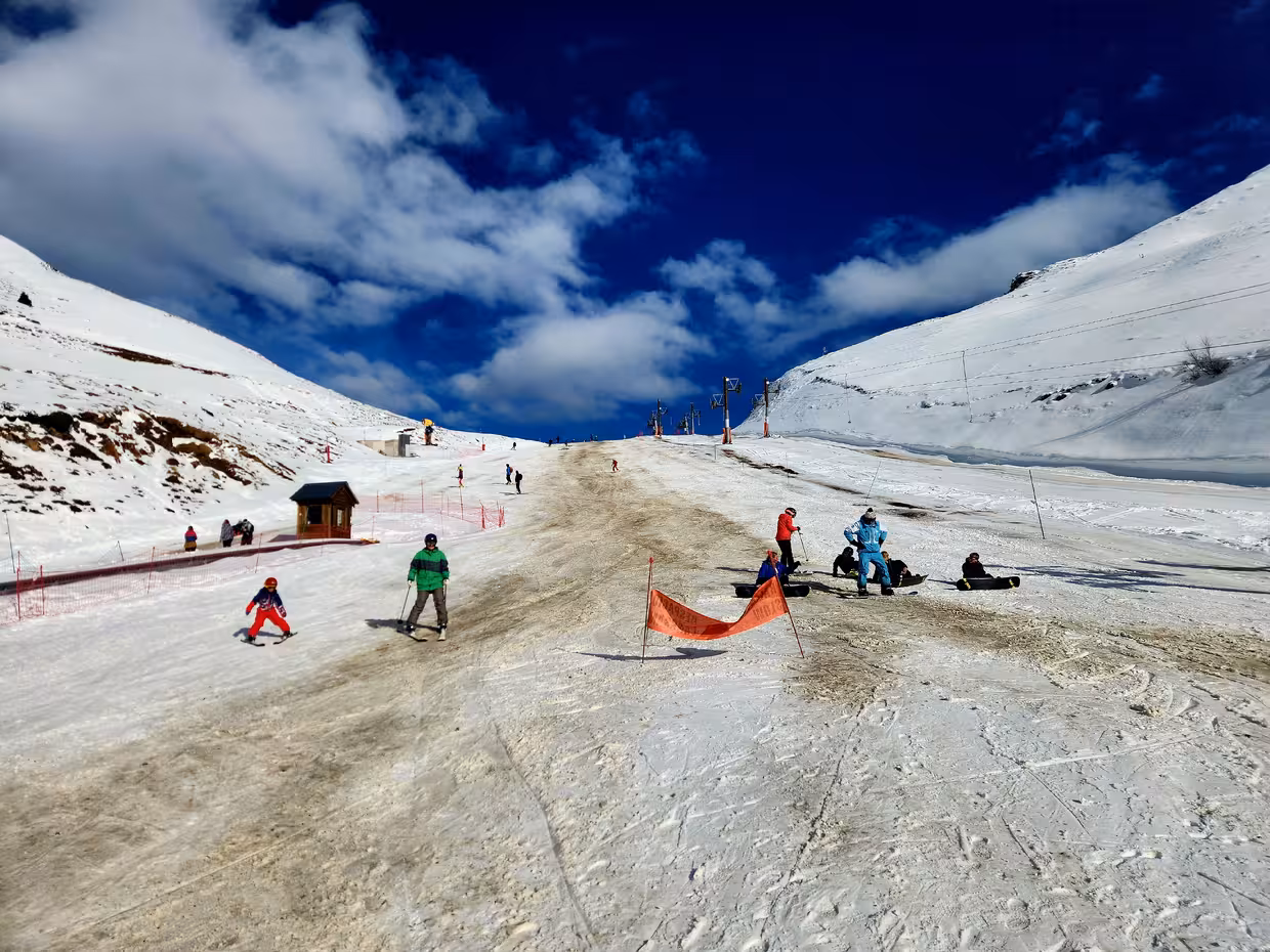 En face Sud, c'est pas folichon, la skiabilité démarre à 1900 m, on est bien loin du retour station en ski. La zone débutant est assez pathétique avec un tapis fermé et 1 téléski. Presque plus de terre et de cailloux que de neige mais cela n'a pas empêché les enfants de bien s'exercer sur cette zone.