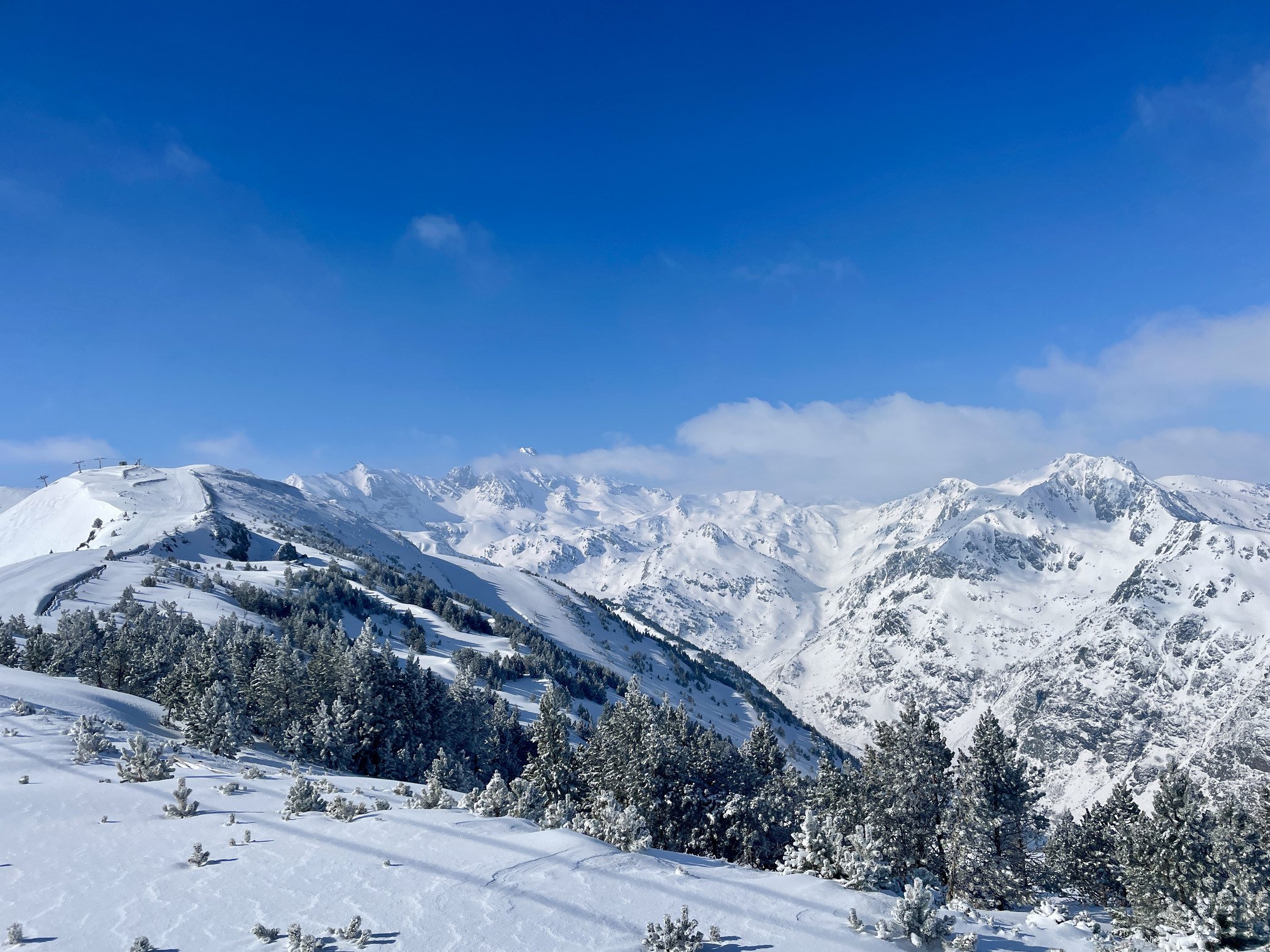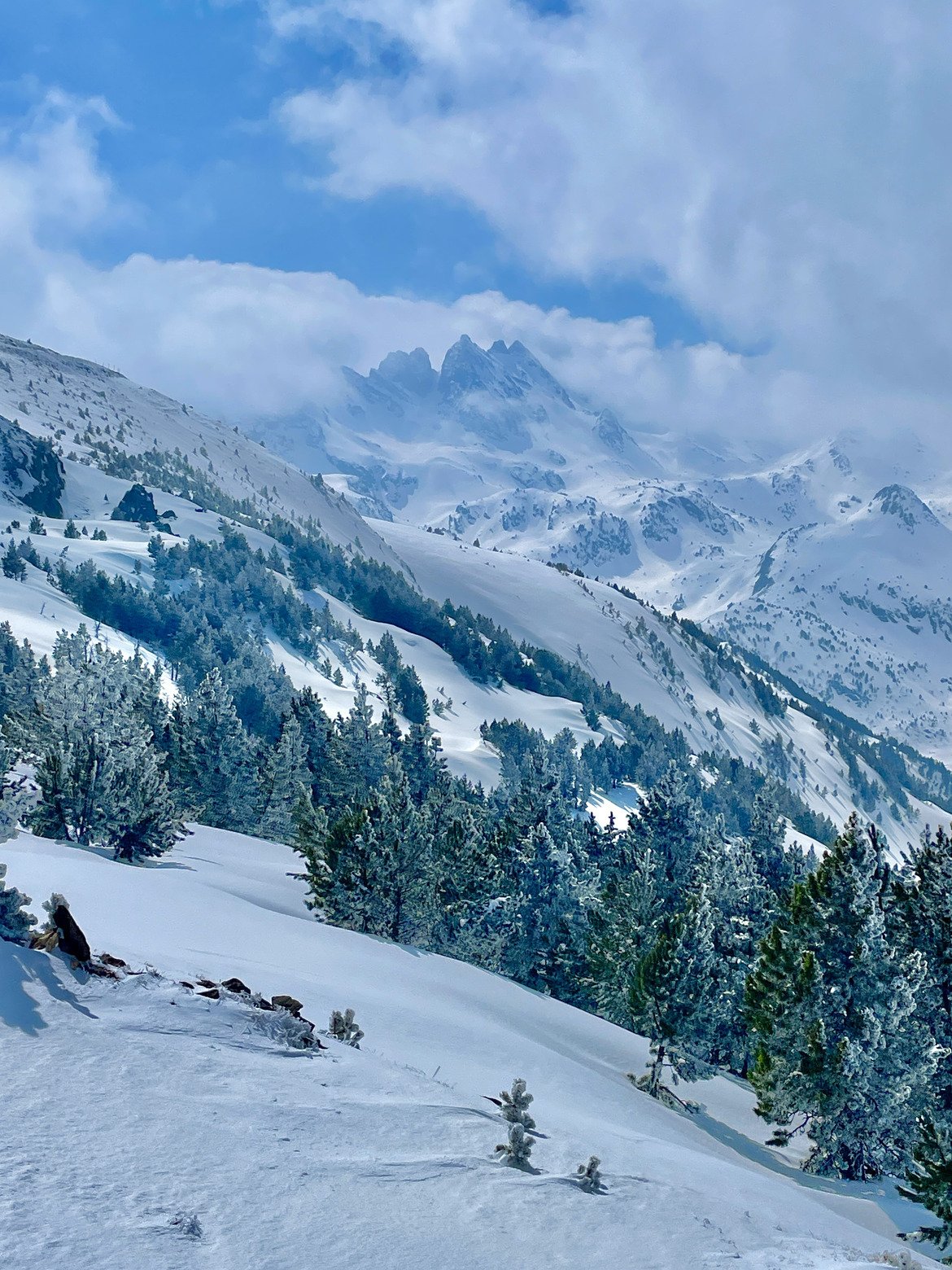 Une journée à ne pas rater sur Ax. Malgré un bon 15 cm tombé dans la nuit et du soleil annoncé aujourd'hui, on était pas plus de 10 à attendre l'ouverture à 9h. Un petit reset idéal pour ne pas sentir la couche de granité de dessous, enchainement de runs avec des traces vierges à faire partout, encore et encore. Un sentiment de station privatisée, j'ai rarement vu la station aussi peu tracée, de quoi en garder encore beaucoup pour demain dans les faces à l'ombre, le soleil de mars ayant fait son oeuvre sur les versants ensoleillés.