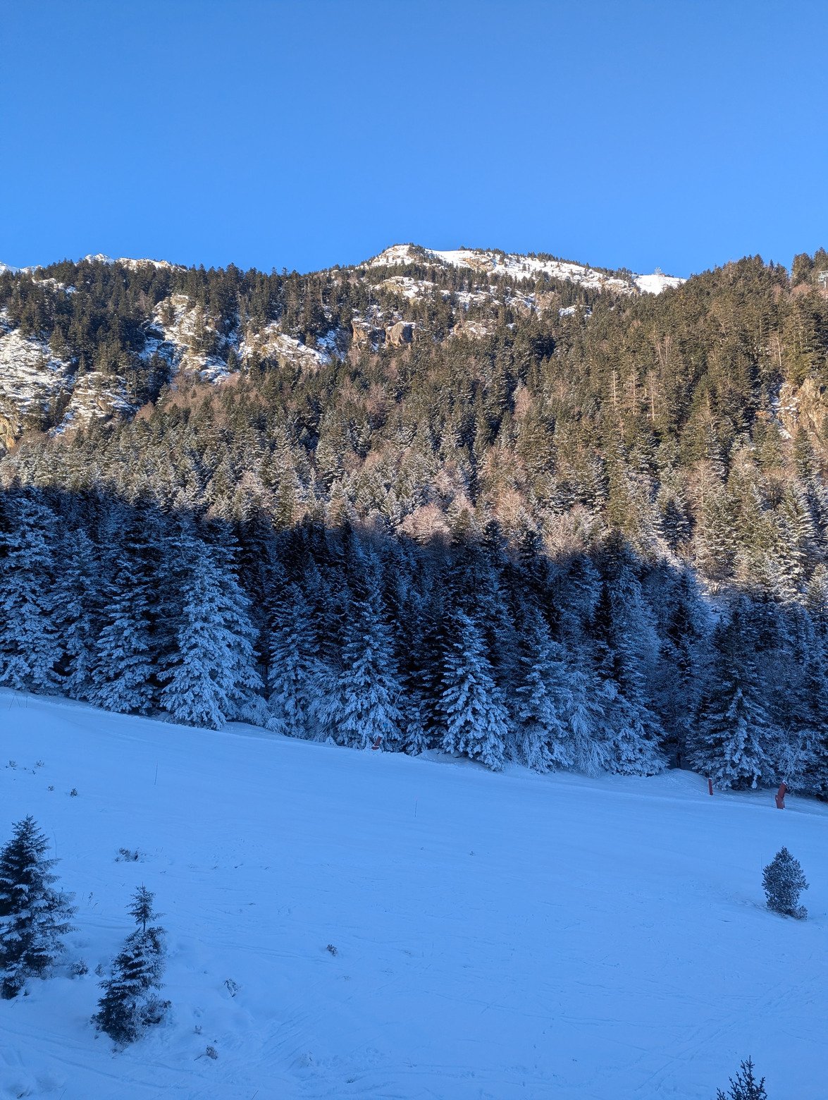 Sans surprise, on se caille (à 10h, -15°C à 2000m). Il y a un grand soleil, mais un peu trop bas pour chauffer fort.