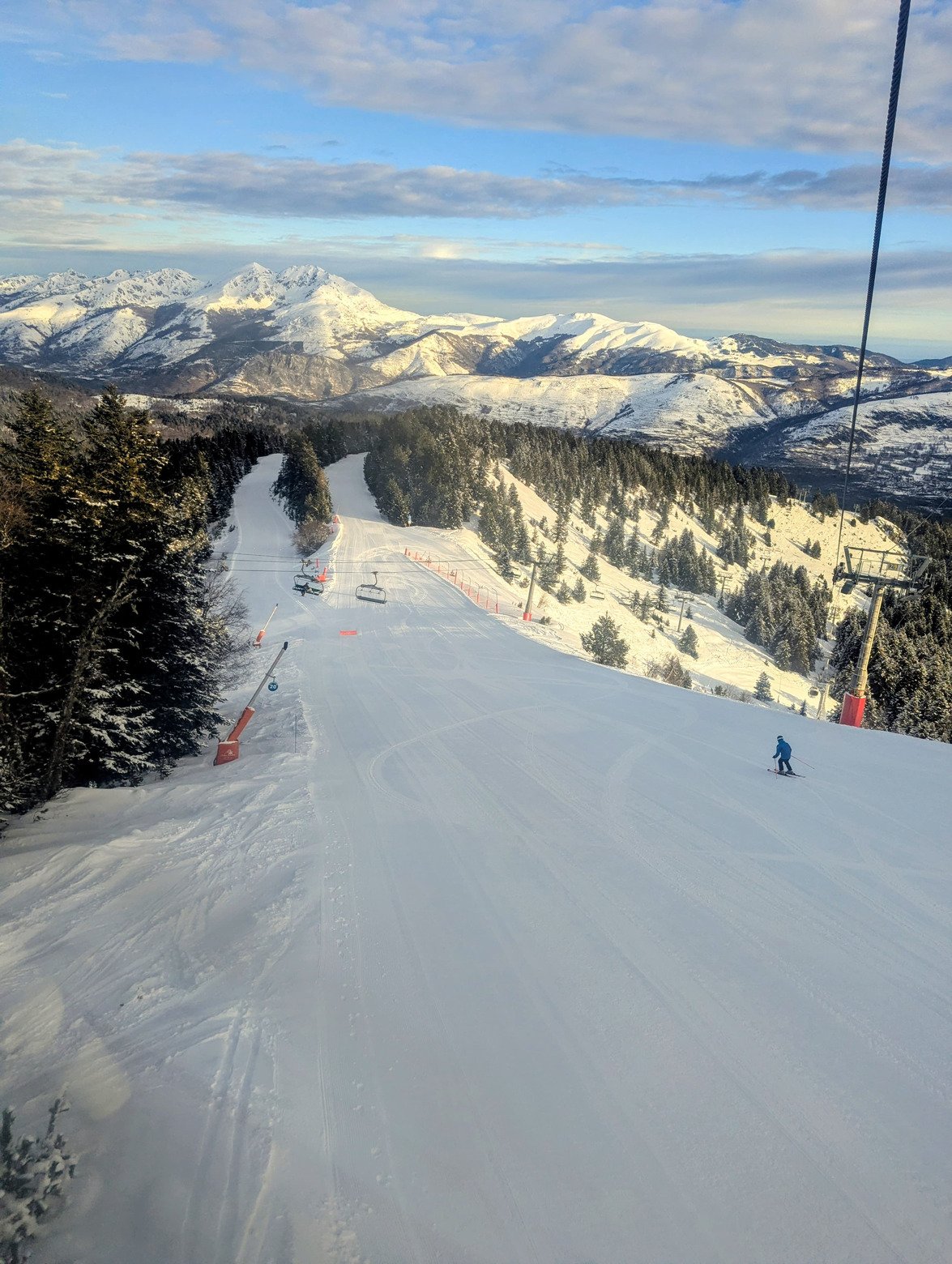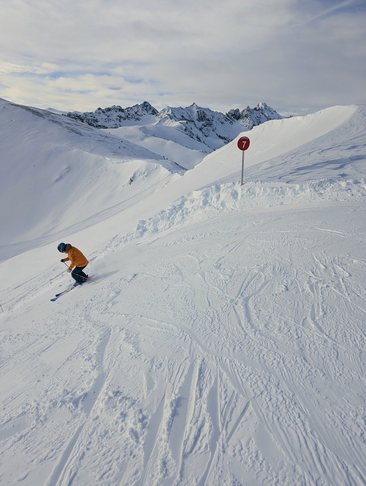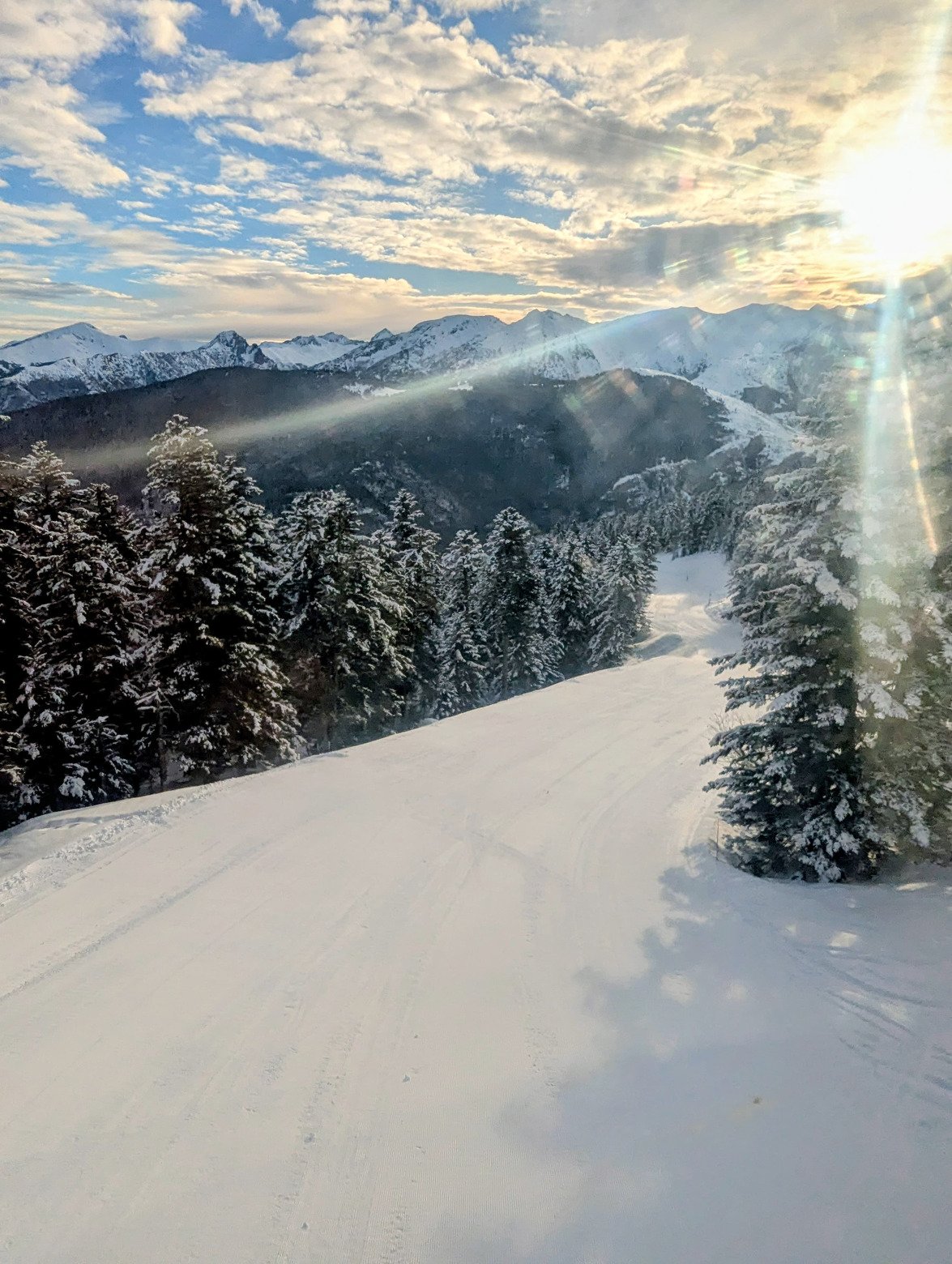 La neige est dure abrasive mais parfaitement damée, ce qui sécurise les premiers virages.
