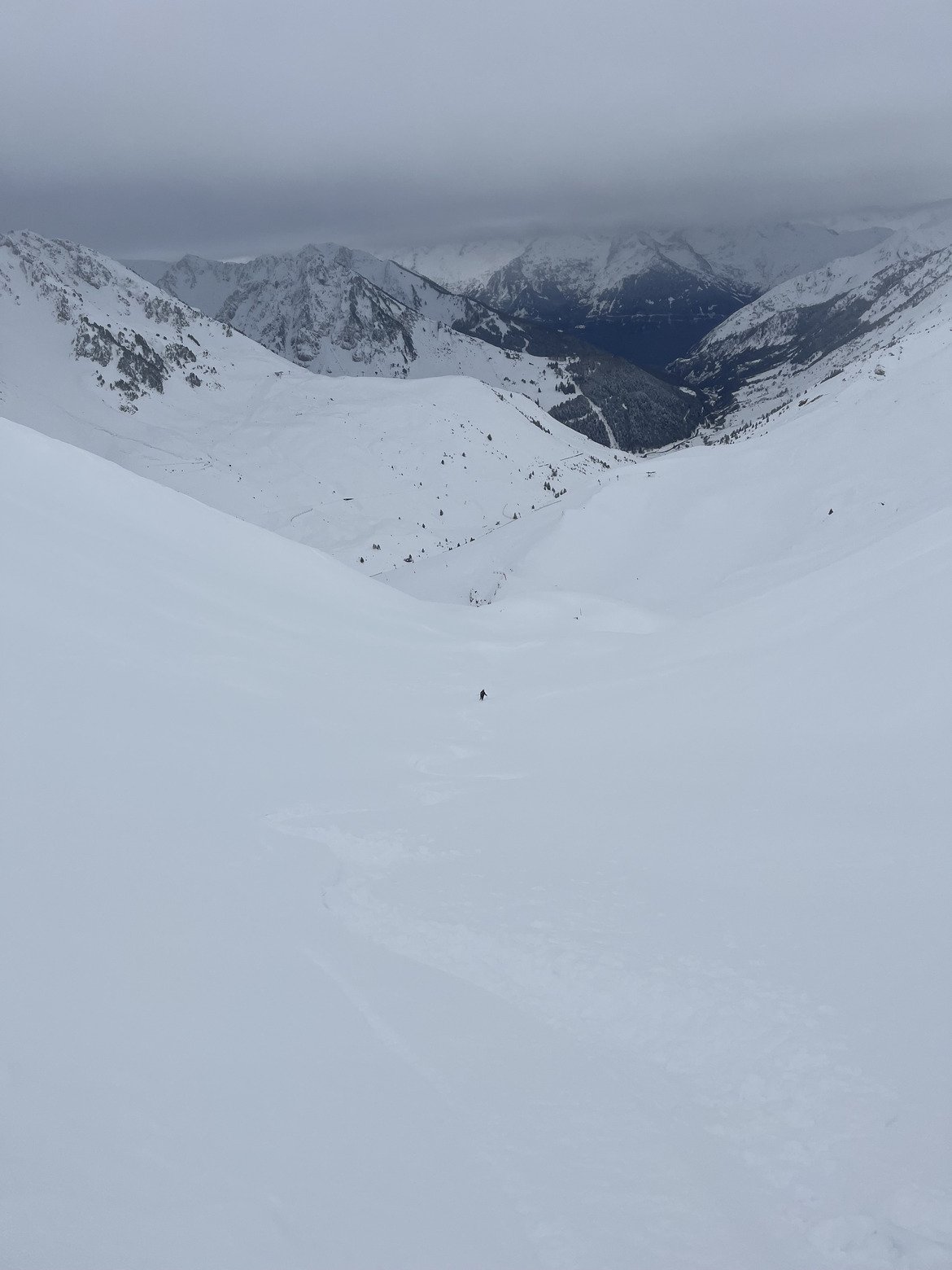 Au sommet la neige est un peu soufflée mais à la descente il y'a bien les 40 + de prévu mais le jour blanc et la neige qui s'humidife gache un peu le plaisir de cette 1 ère descente de l'année.