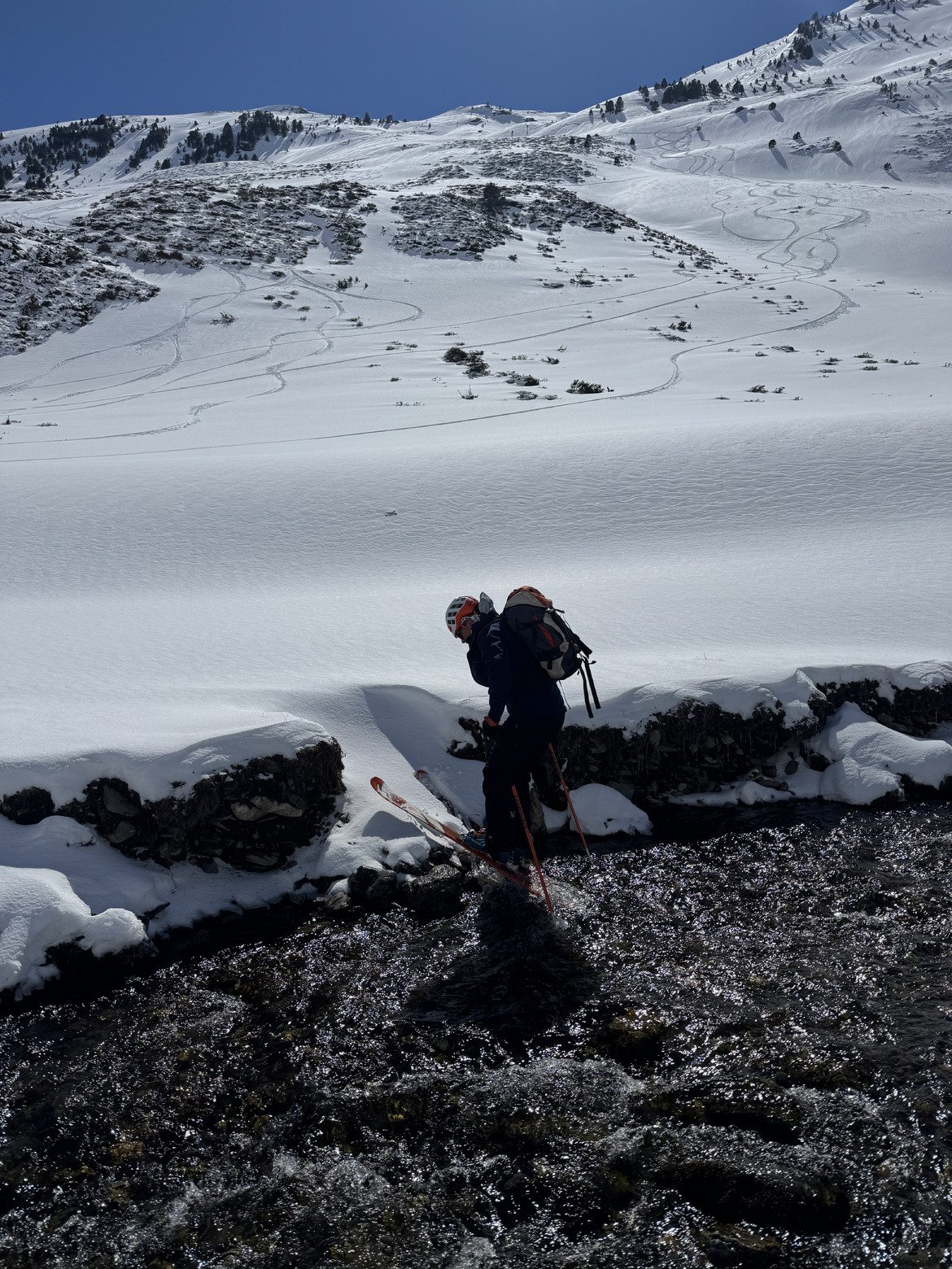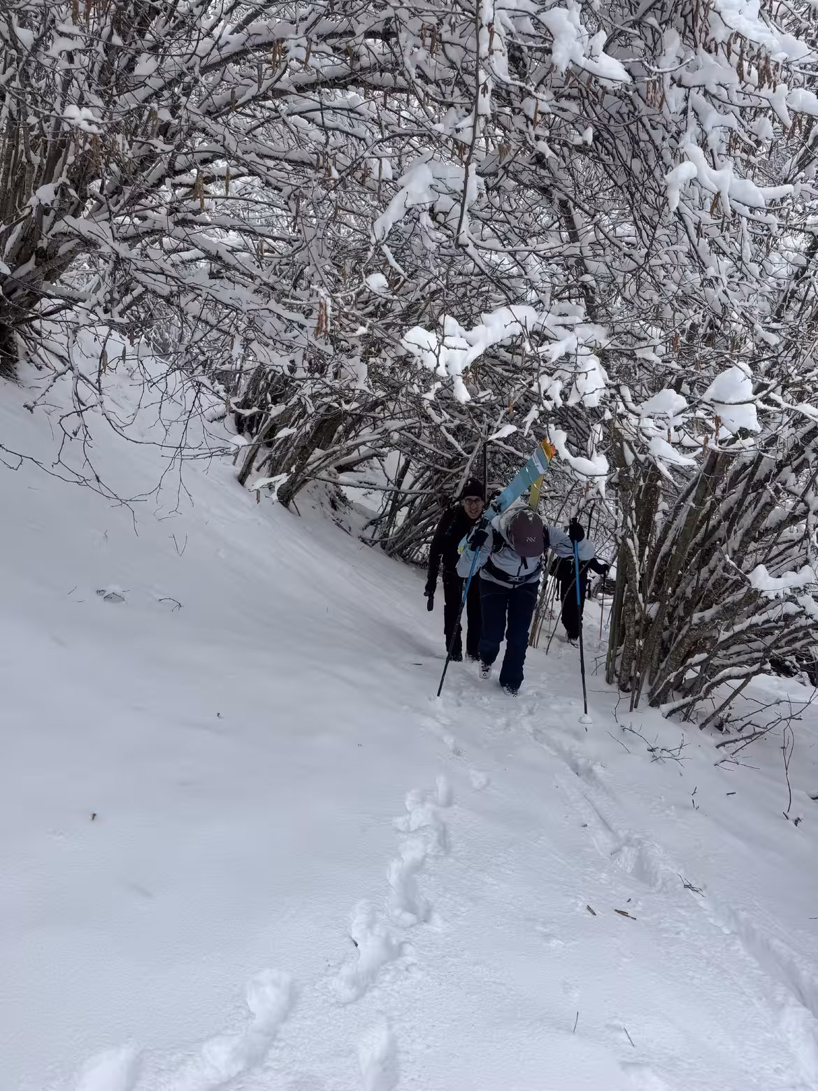A la descente le bas sera plus compliqué nous avons dû finir avec les skis sur le sac.