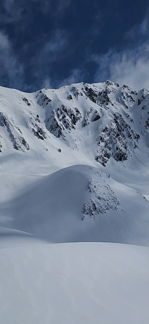 Après le couloir, traversée dans une neige de rêve, puis bascule sur Barèges pour aller chercher un bon couloir Nord Ouest sur le pic Caoubère. Le vallon pour y grimper est magnifique et une fois arrivé au col, poursuite en crampons et bascule sur le run convoité (500 D+). Il a fallu purger l'entrée du couloir, que de la neige poudreuse et la suite, un skieur s'en était occupé la veille. Toute la coulée était ultra poudreuse, ce fût bien réconfortant après l'introduction neige béton et 45 °de pente. On a pu lâcher de beaux virages et ce jusqu'à 1900 m!