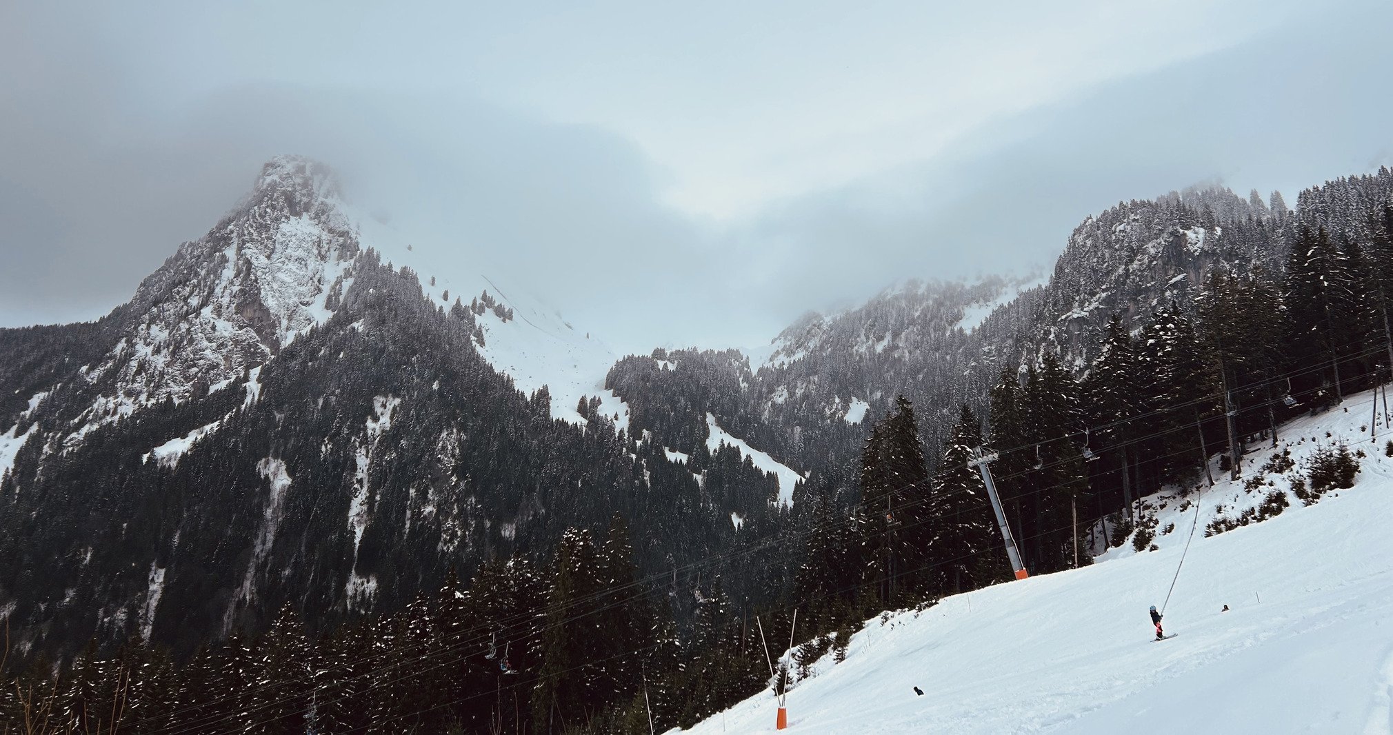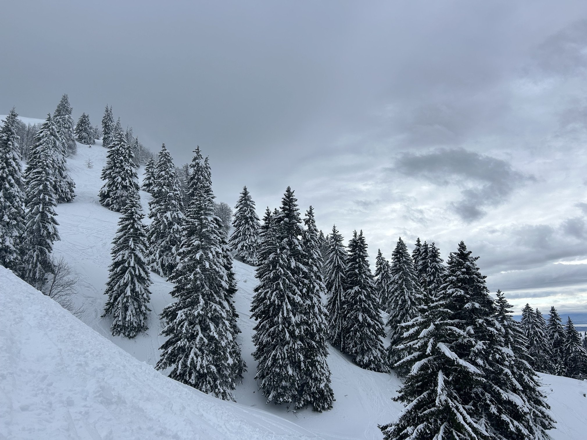 Prêts, on attaque par la rouge du bas ….. et là, la pluie se met à tomber mais pas trop forte!!! Alors on continue! Nous n’avons pas pu monter par la forêt car plus de neige. Nous avons pris les pistes rouges, bleues! Arrivés sur le plateau, la neige était bien mieux et en bonne quantité! On a même eu de la poudreuse sympa en bord de piste 🤩