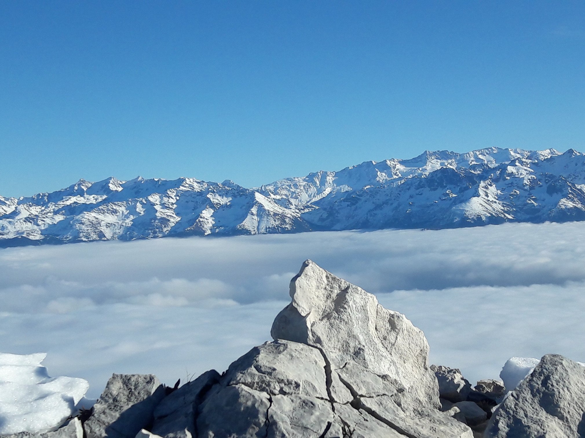 Même si c'est effectivement inskiable, je mets 5/5 à cette sortie rapide et efficace: magnifique mer de nuage, sommets étincelants, soleil 10 000 watts qui chauffe malgré tout, neige parfaite pour le cramponnage. Presque seule au monde en compagnie de choucas trop peu sauvages qui ne se contentent plus des miettes de pain mais viennent directement vous voler votre morceau!