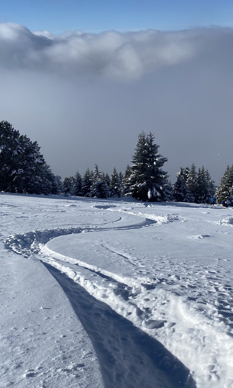 Arrivé sur la crête, la mer de nuages à marée très haute, encercle la plus haute montagne de Chartreuse. Il ne faut pas traîner, juste le temps d’apprécier la féerie d’une Chartreuse presque mieux enneigée qu’en janvier dernier !