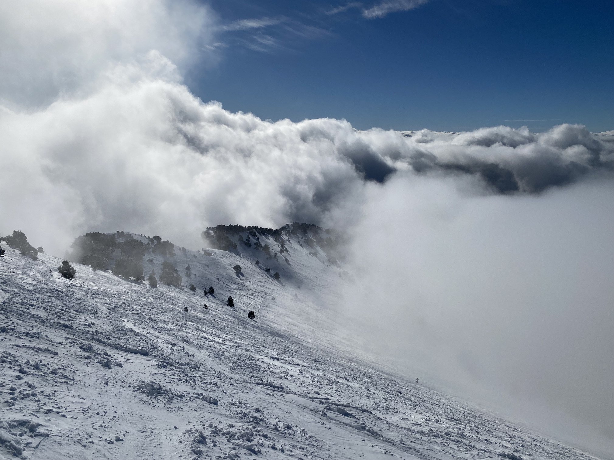 👉 La trace commence à être bien lustrée sur le fond glace et ce, dès le bordercross jusqu’à la prairie mais l’épaisseur de fraîche laisse présager d’une bonne descente et la sortie de la mer de nuages est proche !