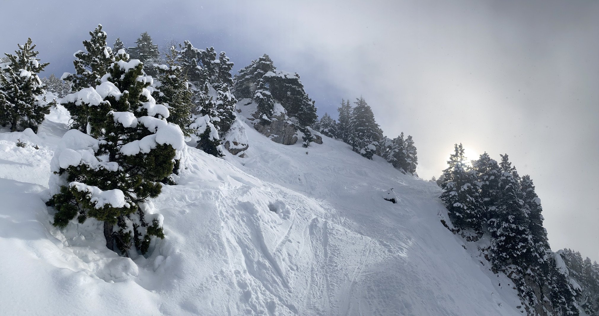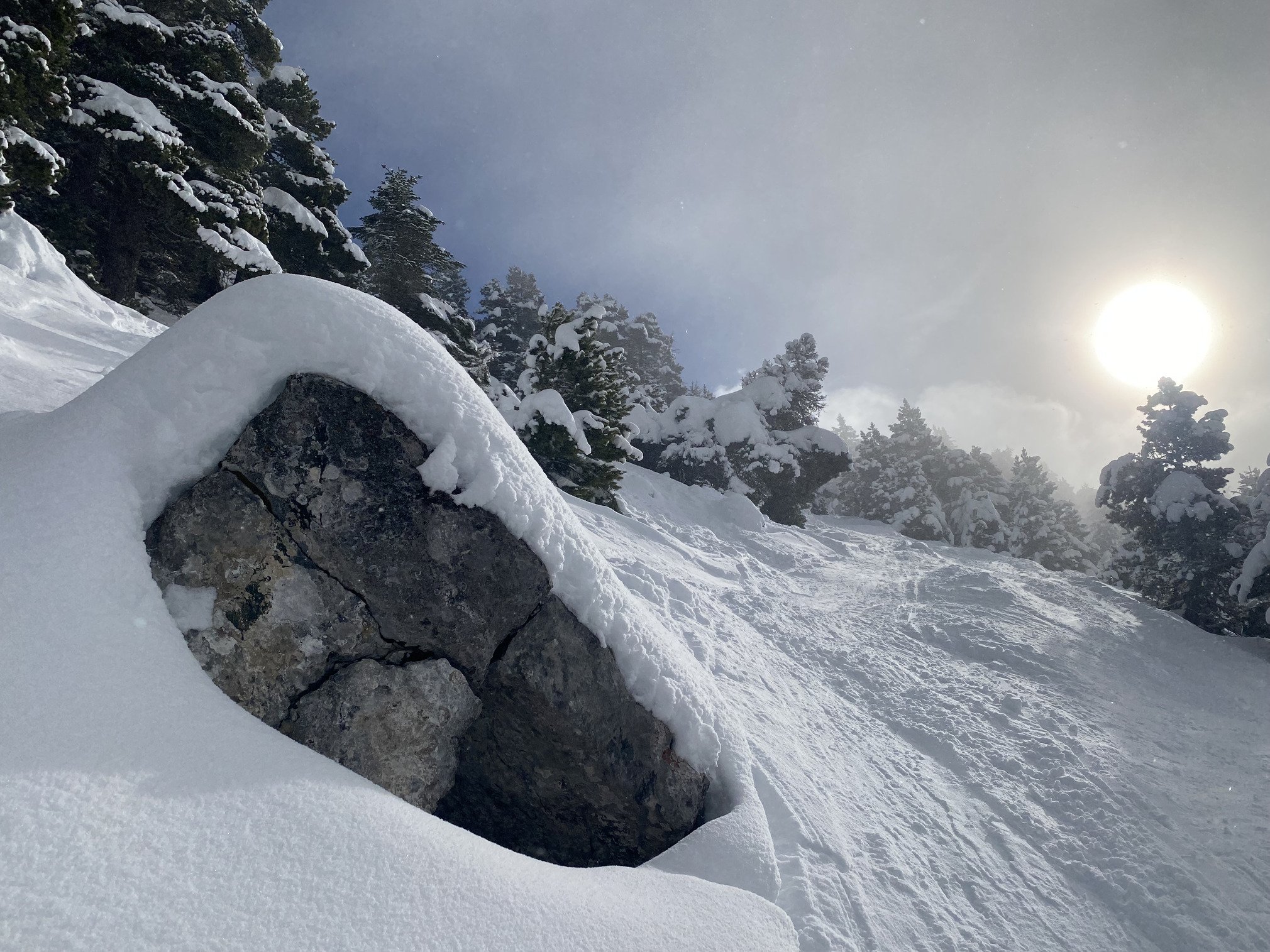 👉 A 1250m : 5cm de poudre fraîchement tombée mais déjà imbibée de flotte…