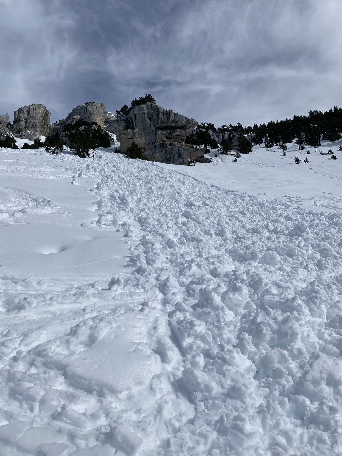 Observation importante: une énorme coulée de neige lourde, large d’une vingtaine de mètres, a descendu toute la face depuis l crête rocheuse séparant le plateau sommitale de la face skiable côté paravalanches, jusque 200 m, sous le rocher de la Folatière… Près de 400m de long !