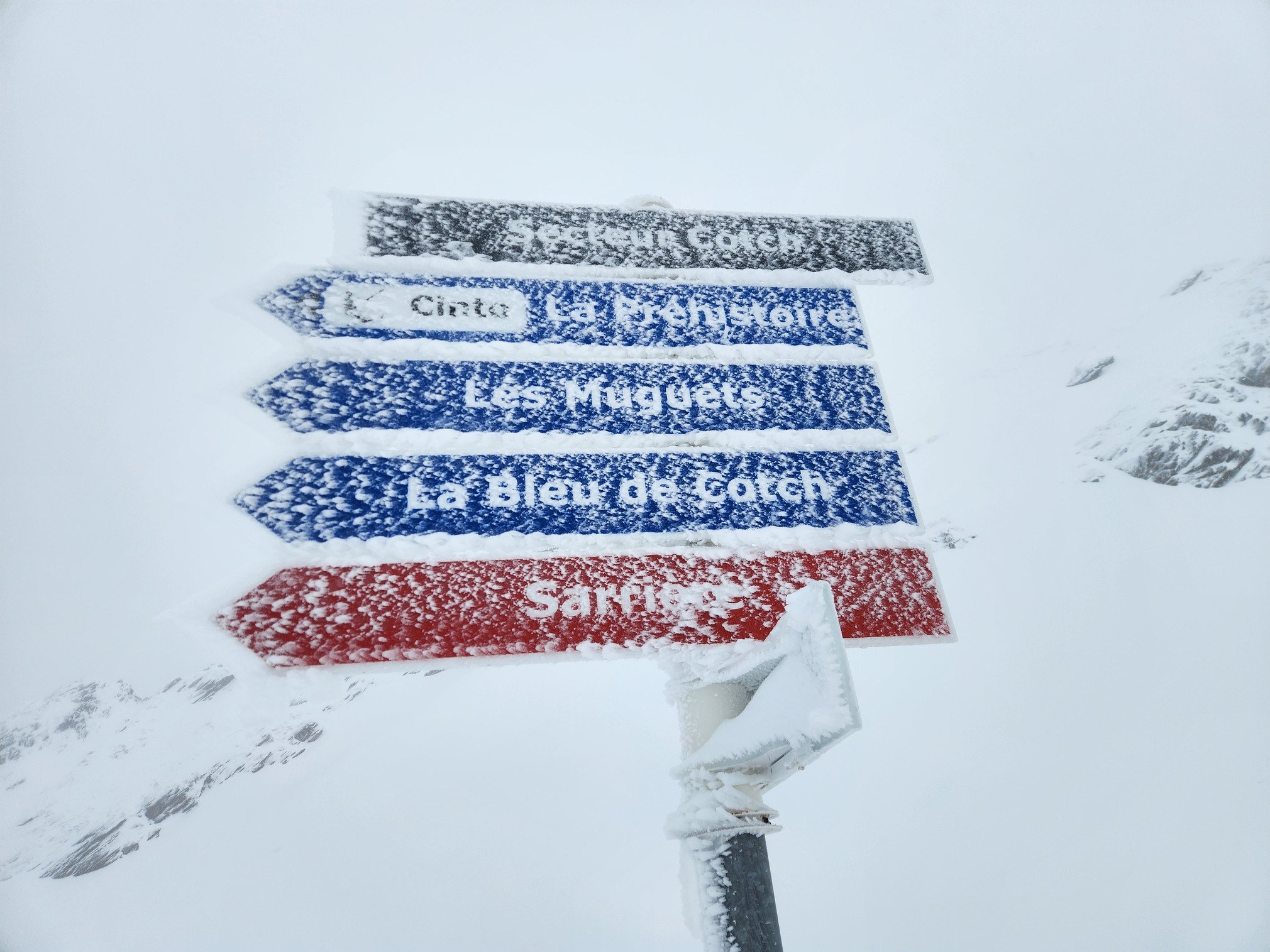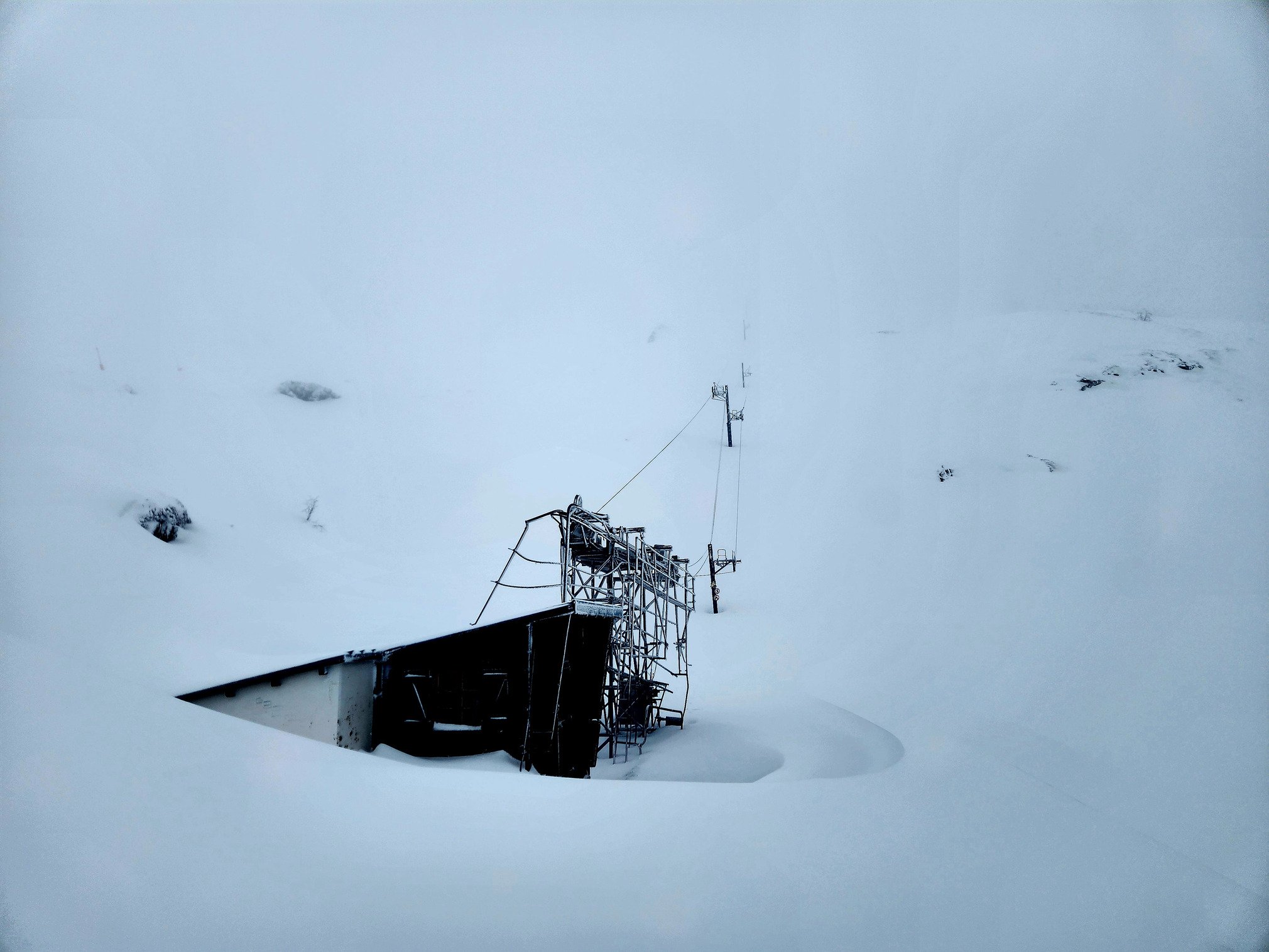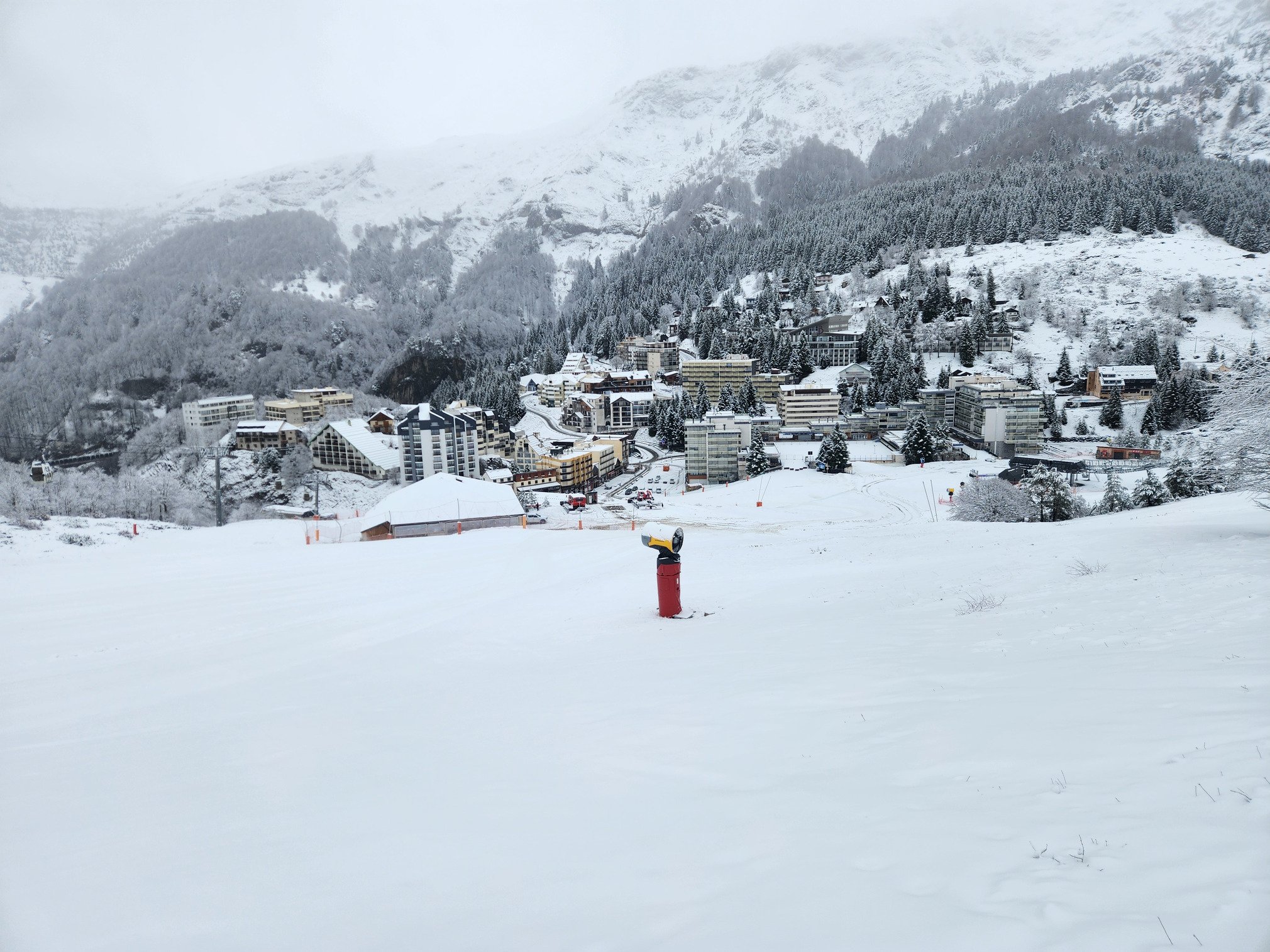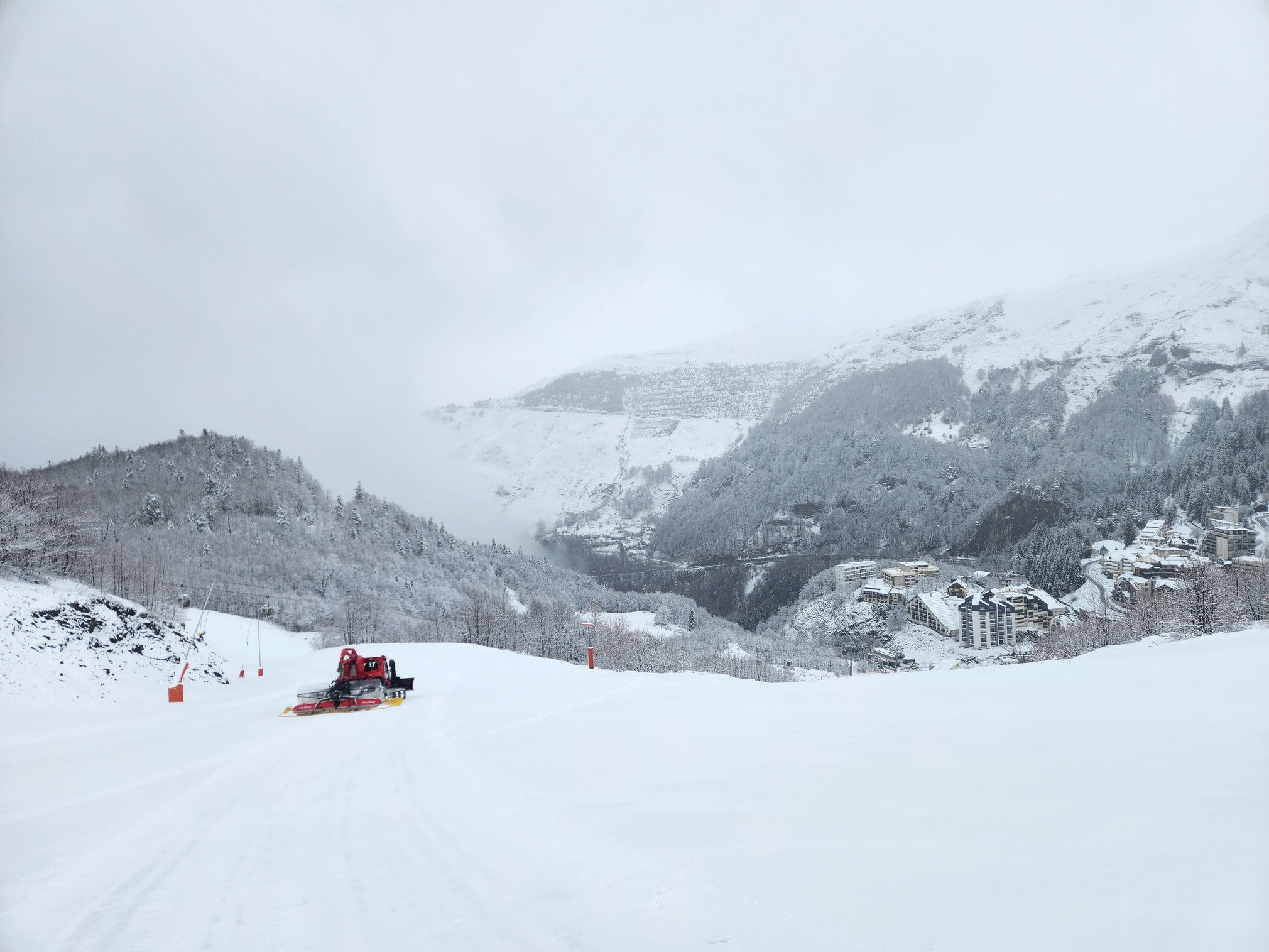 Garé à 10h30, la LPN est bien à 1300 m d'altitude. Station fantomatique mis à part des véhicules de chantier et des dameuses en action, je remonte le front de neige sous un fin grésil. Peu après, je croise un pisteur qui m'informe que des engins circulent sur le domaine pour le rangement de fin de saison faisant suite à la fermeture de dimanche dernier.