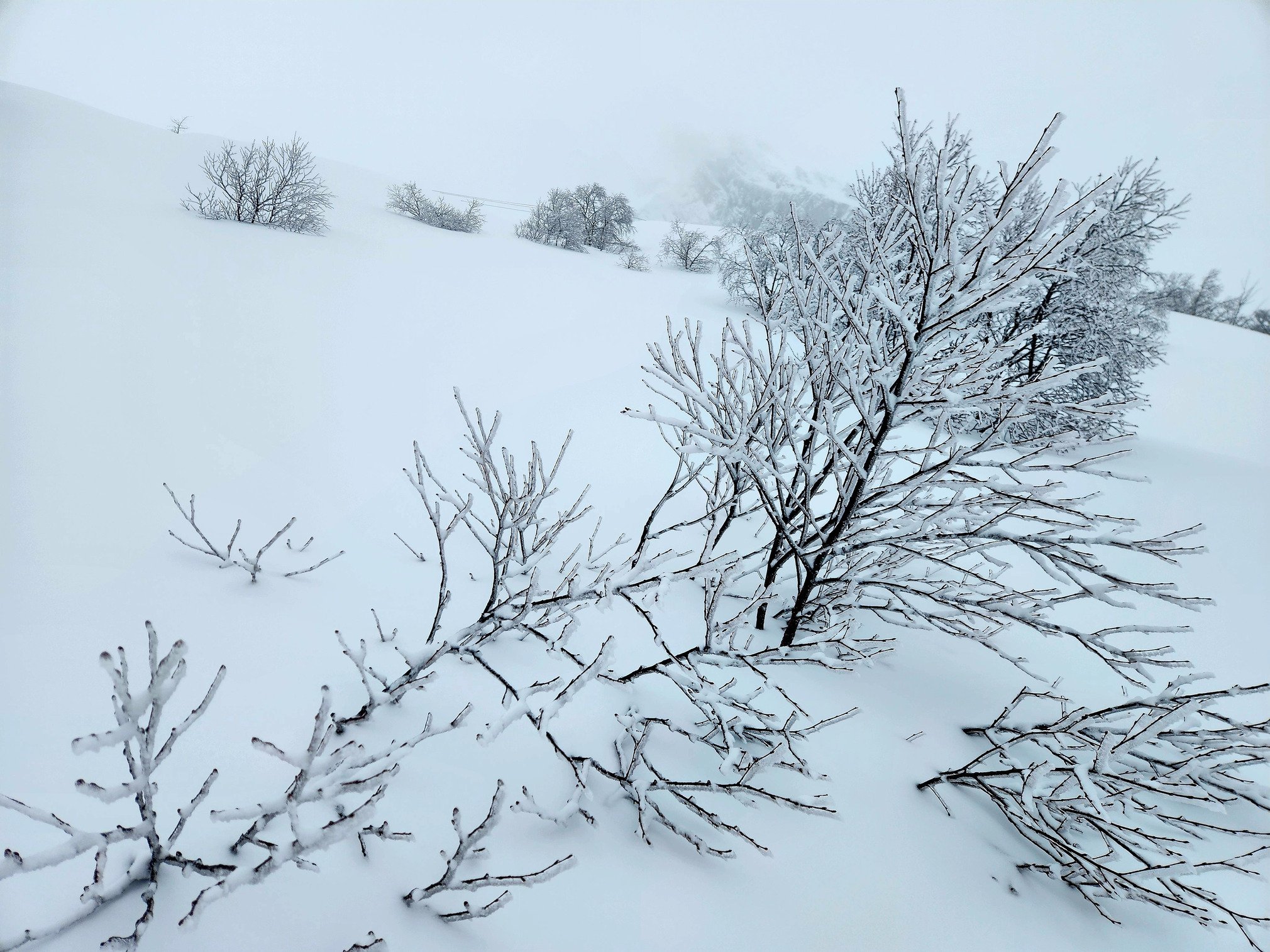 La quantité de neige est plus importante en altitude mais la neige reste assez humide jusqu'à 2000 m. Je suis monté jusqu'à 2300 m et là ce fût un peu meilleur mais comme souvent le vent a fait des ravages. Mis à part les endroits vraiment protégés, la couche à skier est assez fine tout en étant bien fluide pour glisser!