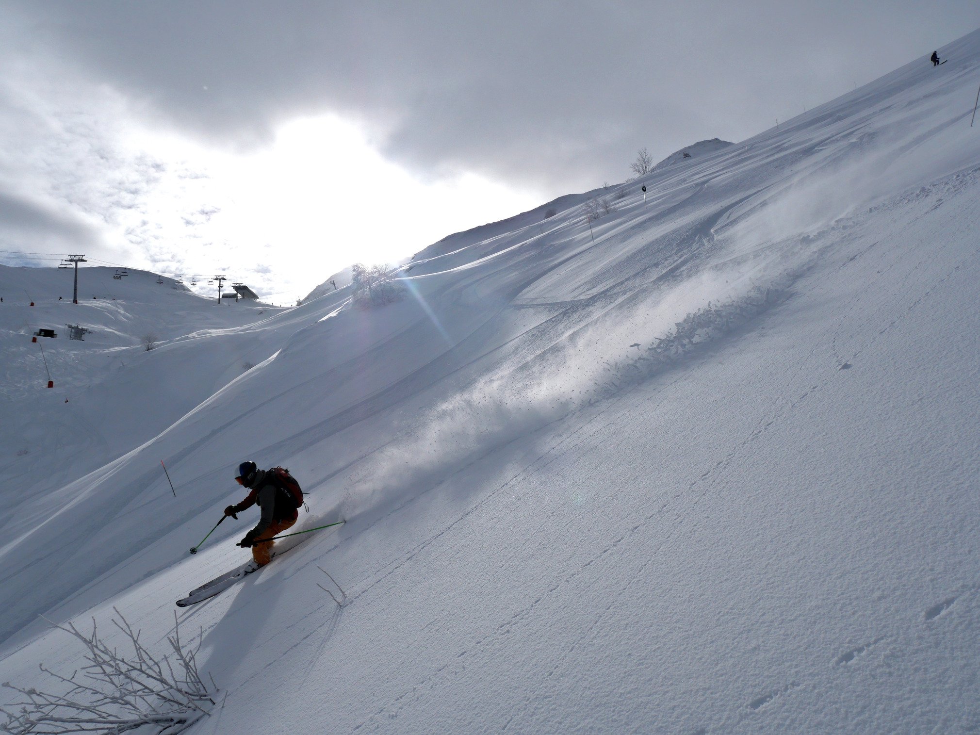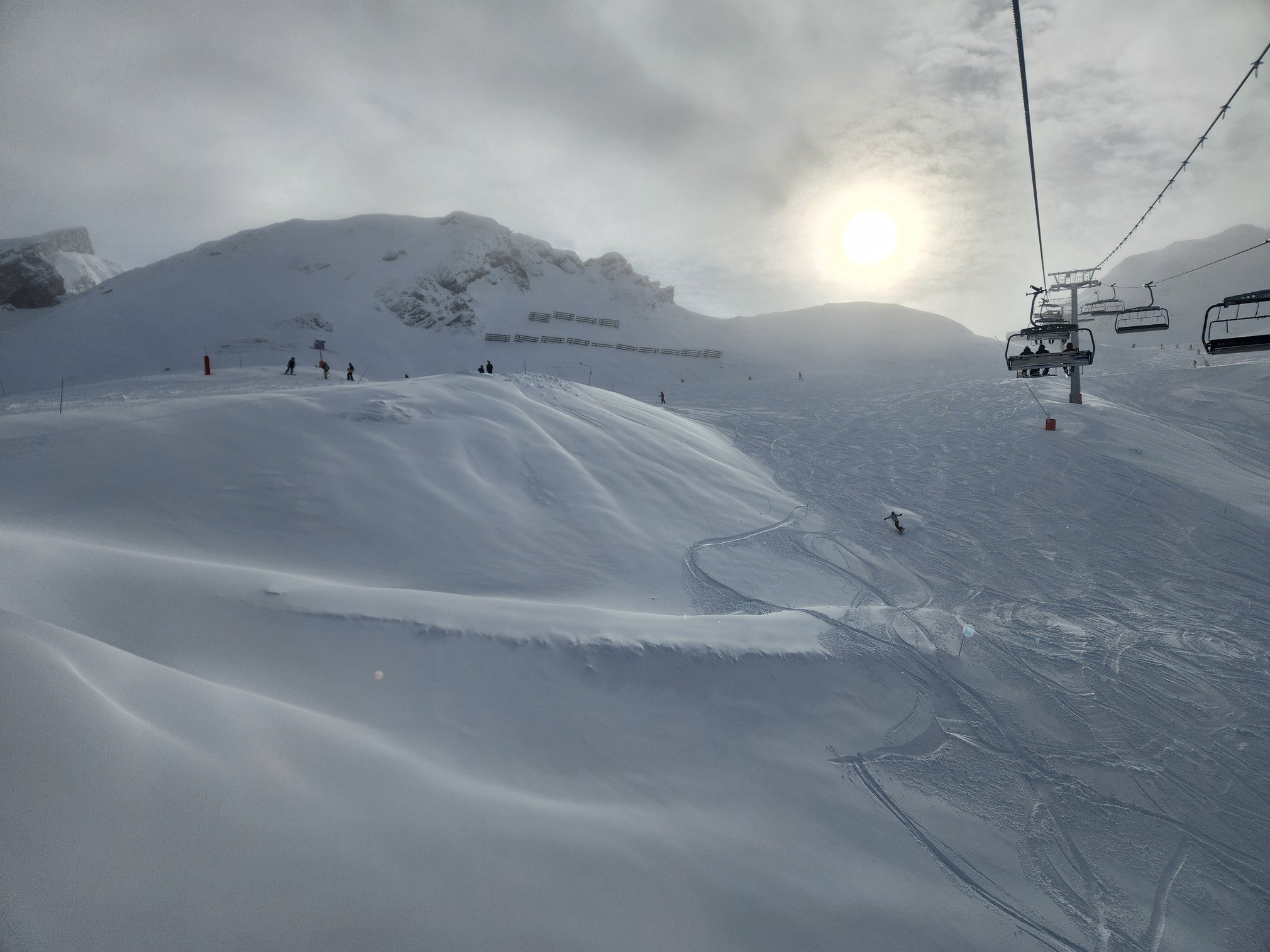 Arrivés peu avant 10h, c'était parfait à la fois pour la luminosité qui commençait à poindre le bout de son nez et pour la fin de la sécurisation du domaine avec des PIDA musclés. Effectivement un bon 30 cm à 1300 m et un gros chouia plus en altitude. Il fallait éviter les zones ventées mais sinon globalement une neige dense à poudreuse selon les spots.