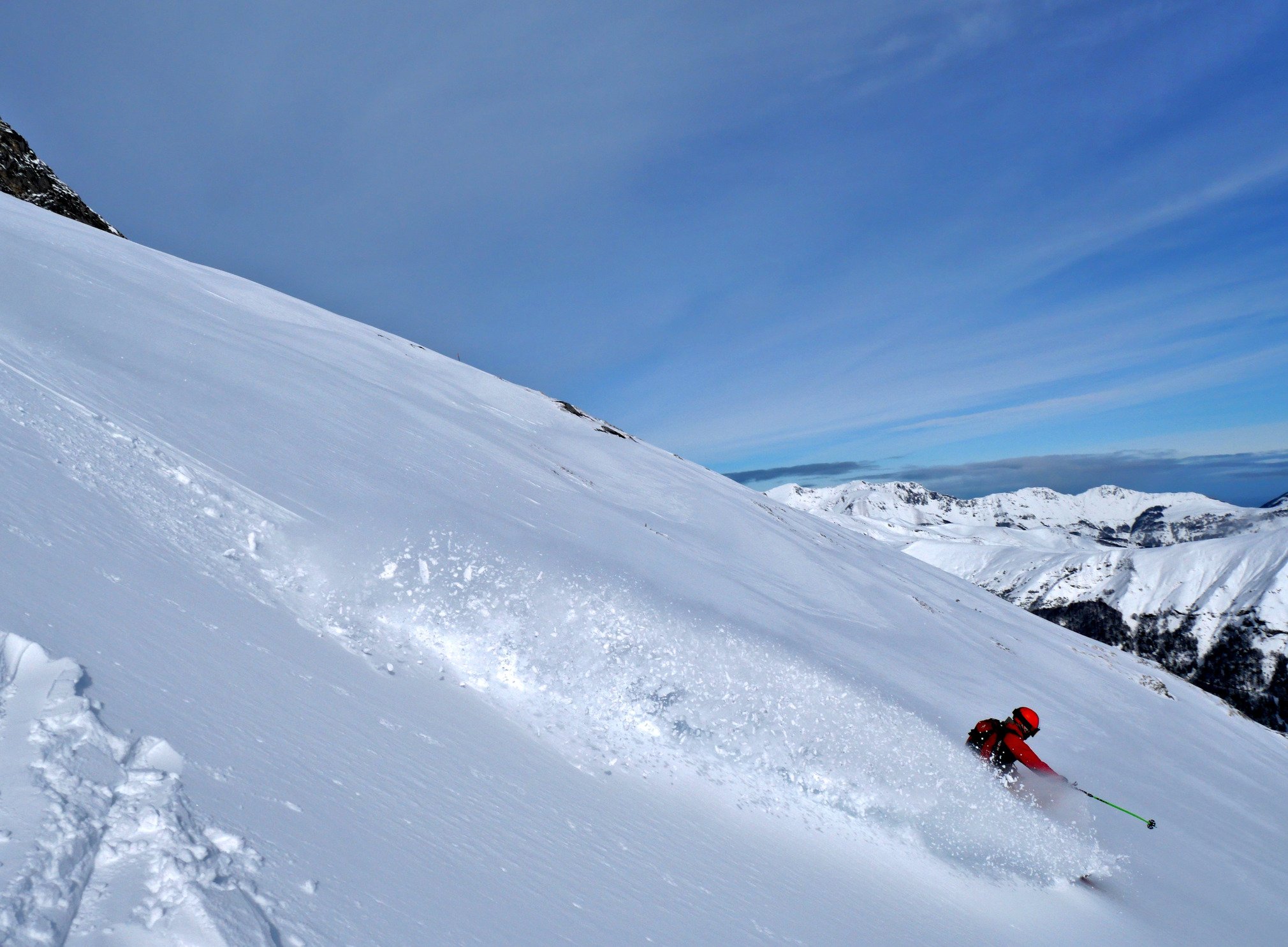 Malgré un grand nombre de coulées sur les flancs du pic du Ger, il y avait de très beaux espaces pour carver dans la poudre. Au final, blue bird de 11h à 14h30 et puis ,comme promis, un vent chaud commençait à s'énerver et c'était le retour du jour blanc. J'ai ressorti les Icelantic Shaman avec leurs spatules de 160 mm, mon pote était avec des Armada Booba, on s'en est mis plein les nasaux et les quadri. ! C'était peut-être la super séquence de janvier mais le mois n'est pas fini. C'est incroyable cet hiver dans les Pyrénées, l'enneigement commence vraiment à être conséquent. Pourvu que cela dure.