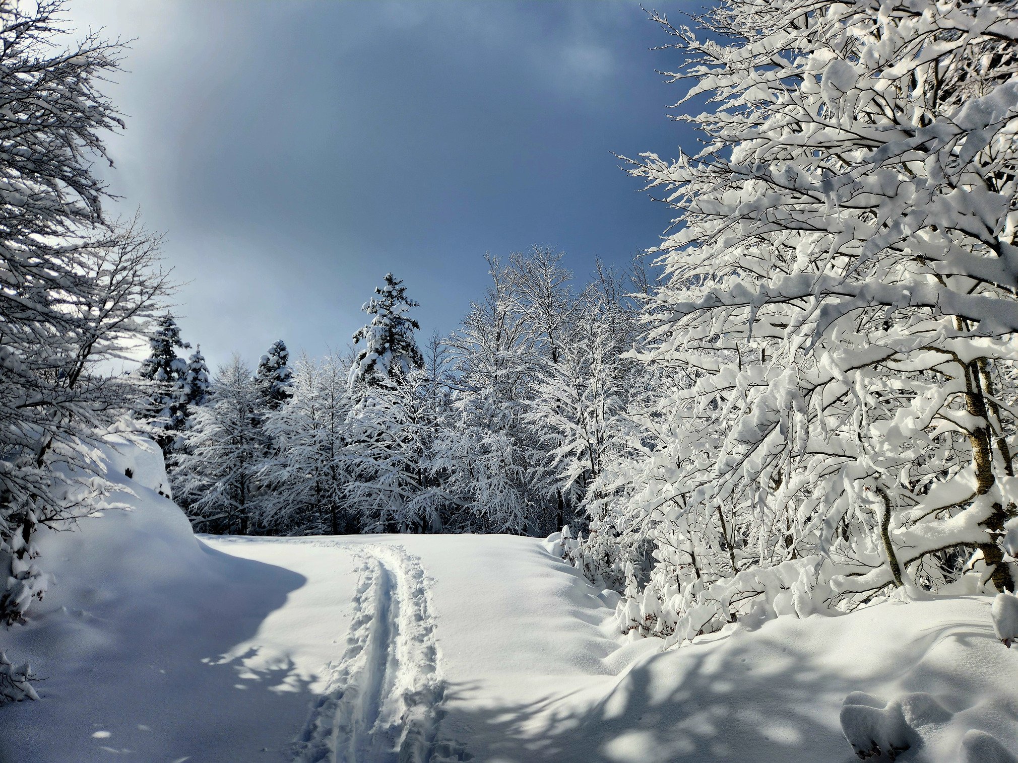 L'ascension en direction du Soum Couy était féerique, les pins à crochets étaient bien platrés. On a apprécié la trace tranchée faite par les intrépides qui ont bravé la mauvaise visibilité. Au sommet de notre promenade, on a mesuré 55 cm.