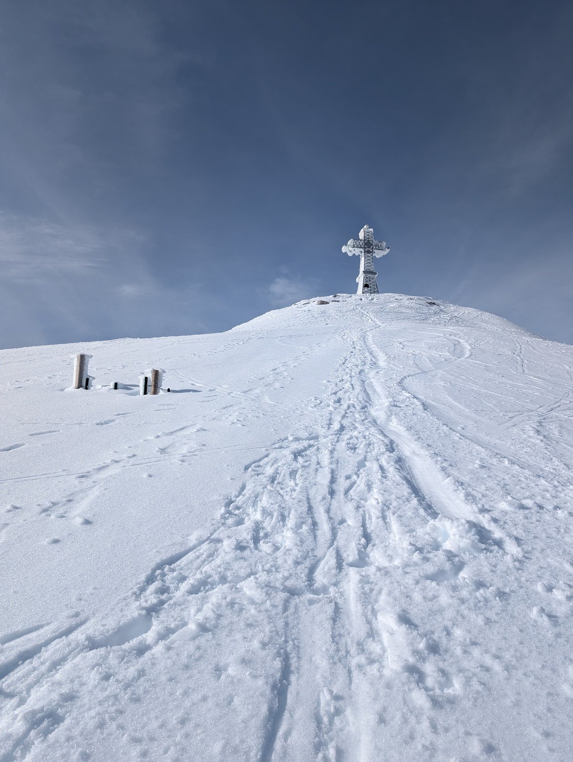 Depuis les silos, la quantité de neige tombée permet de monter directement et tout droit vers la croix. Je mets les couteaux sur la falaise de 2m habituellement en pierre, mais là, recouverte d'une neige croutée et dure. Les traces facilitent le passage, pas besoin de déchausser.