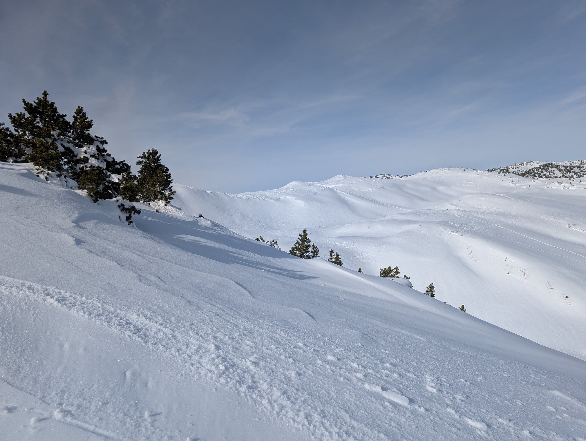 Je fais la descente sur la combe de droite. La neige est bonne au soleil, quoiqu'un peu molle.