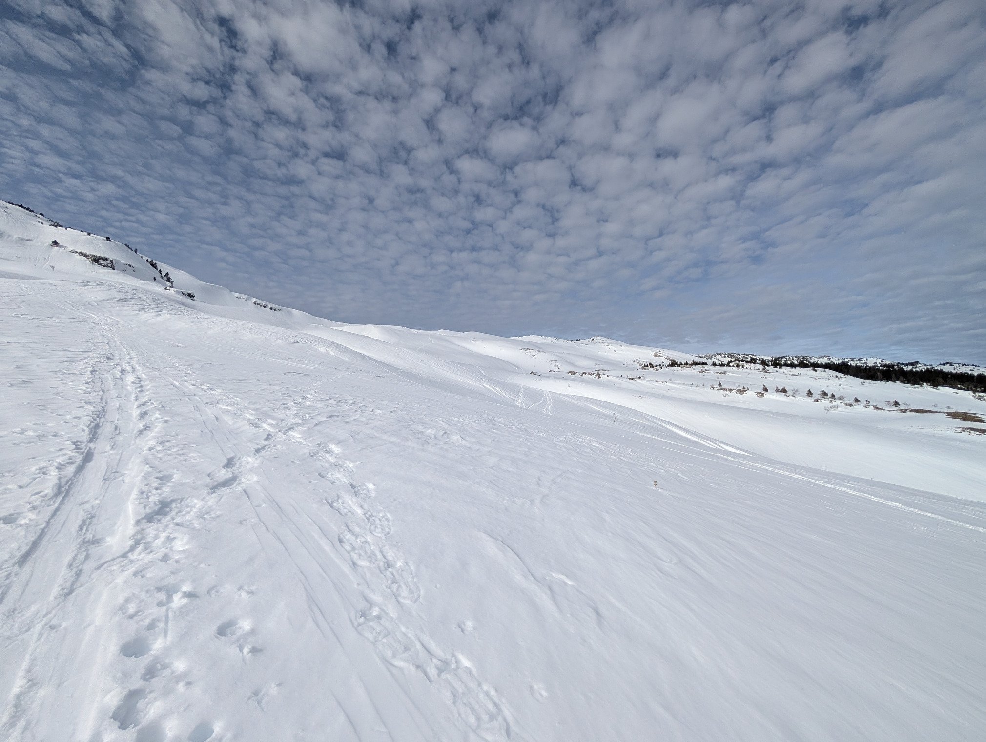 Le portage se fait sur 400m depuis le parking, puis on chausse dans un neige molle, sur la route forestiere. La montée jusqu'à la Croisée, puis les silos se fait bien malgré un bon nombre de trous laisser par des randonneurs en chaussure.