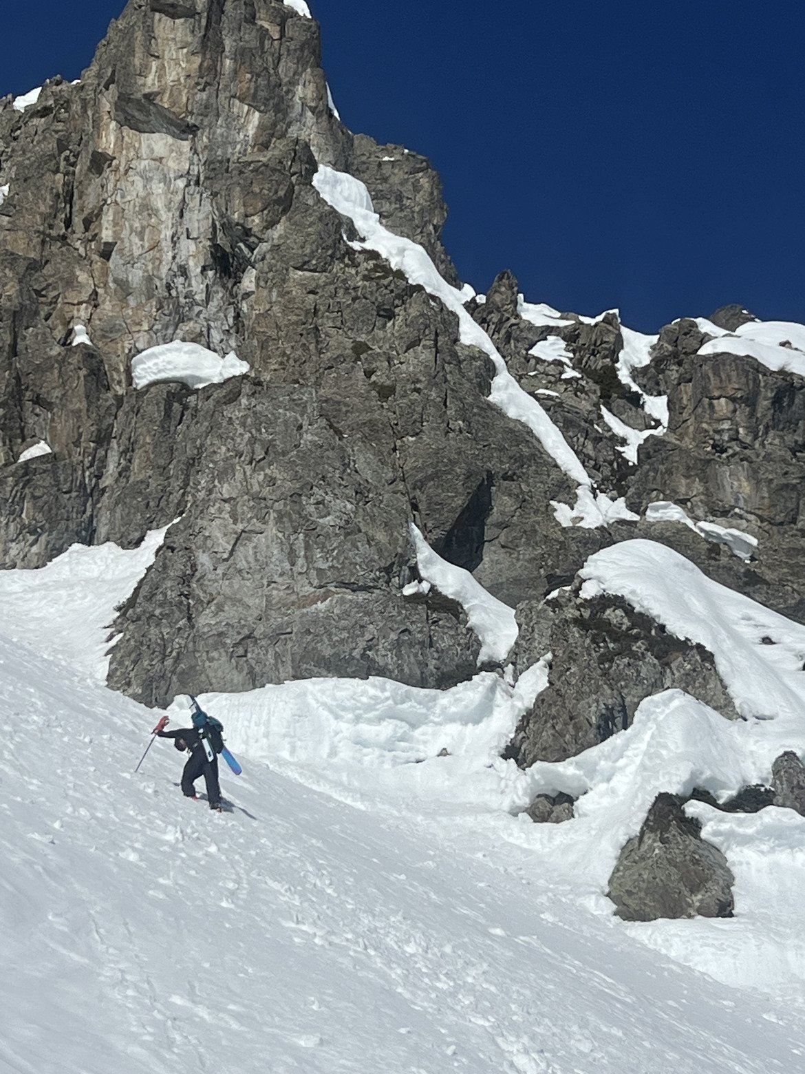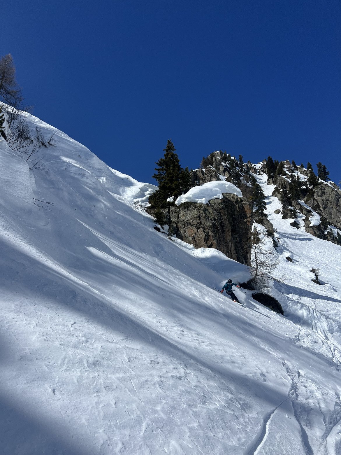 De très belles conditions aux Marecottes. La neige transforme dès tôt le matin au soleil, il y’a des belles moquettes jusqu’à très haut sur tout ce qui prend le soleil. Plus bas il reste encore de la poudre froide dans les parties bien à l’ombre. C’est top, il n’y a presque rien à jeter.