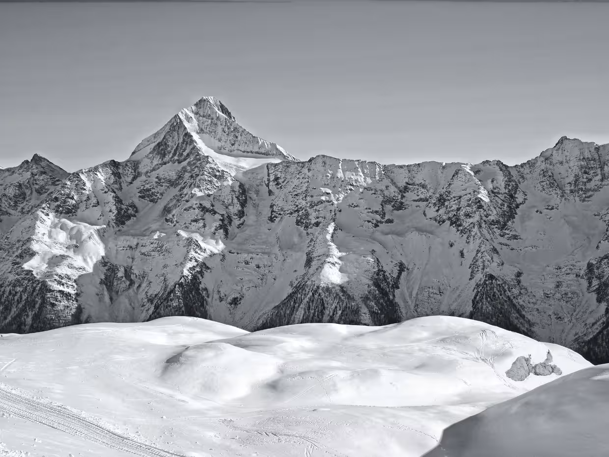 10h30 : après 2 télésièges et un œuf, nous voici à 3100m au Hockenhorngrat. La météo est incroyable : blue bird, il fait doux, pas de vent. Nous restons un moment à observer les sommets environnants. Face à nous, le Bietschorn siège en maître des lieux. Il est omniprésent. Au loin, le Cervin et tous les autres aussi.
