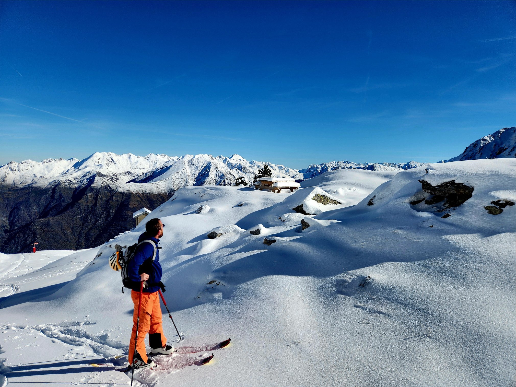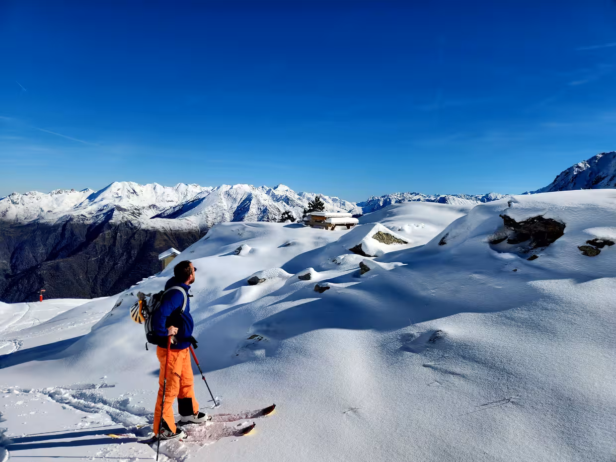 Déjà 4 traces, c’est la bousculade ! De moins de 10 cm à 1800 m on passe à 20/25 au dessus de 2000 m. Arrivés en haut du domaine skiable (2500 m), à côté du col de la Cloze, on mesure un bon 35 cm. De la poudre tassée, de la croute légère, neige décaillée en bonne moquette, neige gelée, voilà les différentes textures que nous avons rencontrées. Un petit 700 m de dénivelé, du soleil et un iso rapidement à 2900 m, pas de vent, des bons virages, nous sommes repartis bienheureux de cette reprise ! Dommage qu’un énorme redoux va tout gâcher.