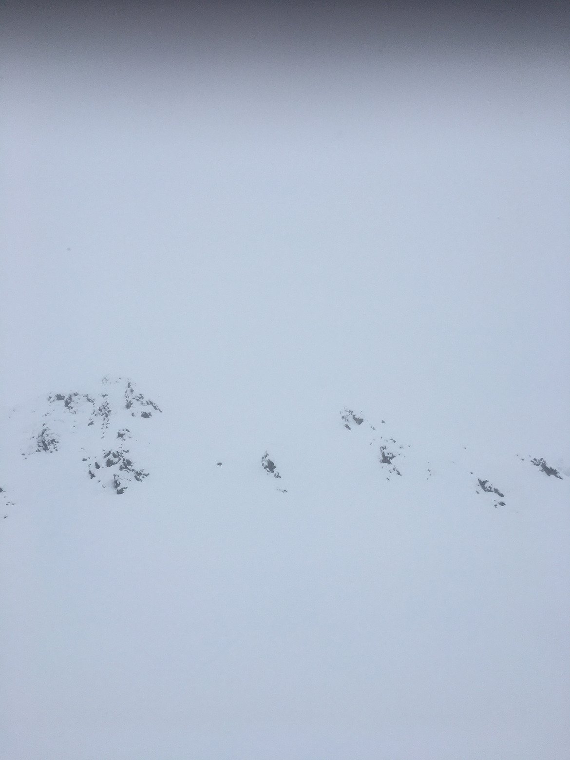 Sur les pistes de bon matin, de la neige jusqu’aux mollets partout, humide et dense. Visibilité proche du néant… des flocons plein le masque, qu’on doit essuyer tous les 2 virages.