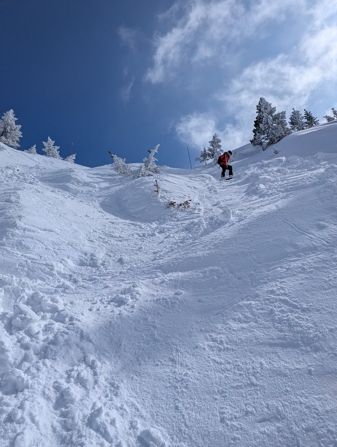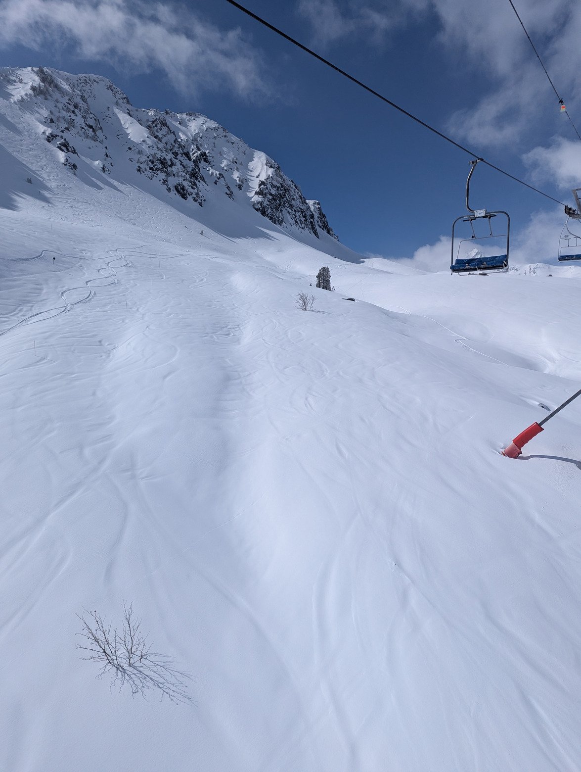 À midi une seule trace sur Martin Bonis. À 15h sur La Cheminée, neige encore légère pas transformée. Une vraie régalade.