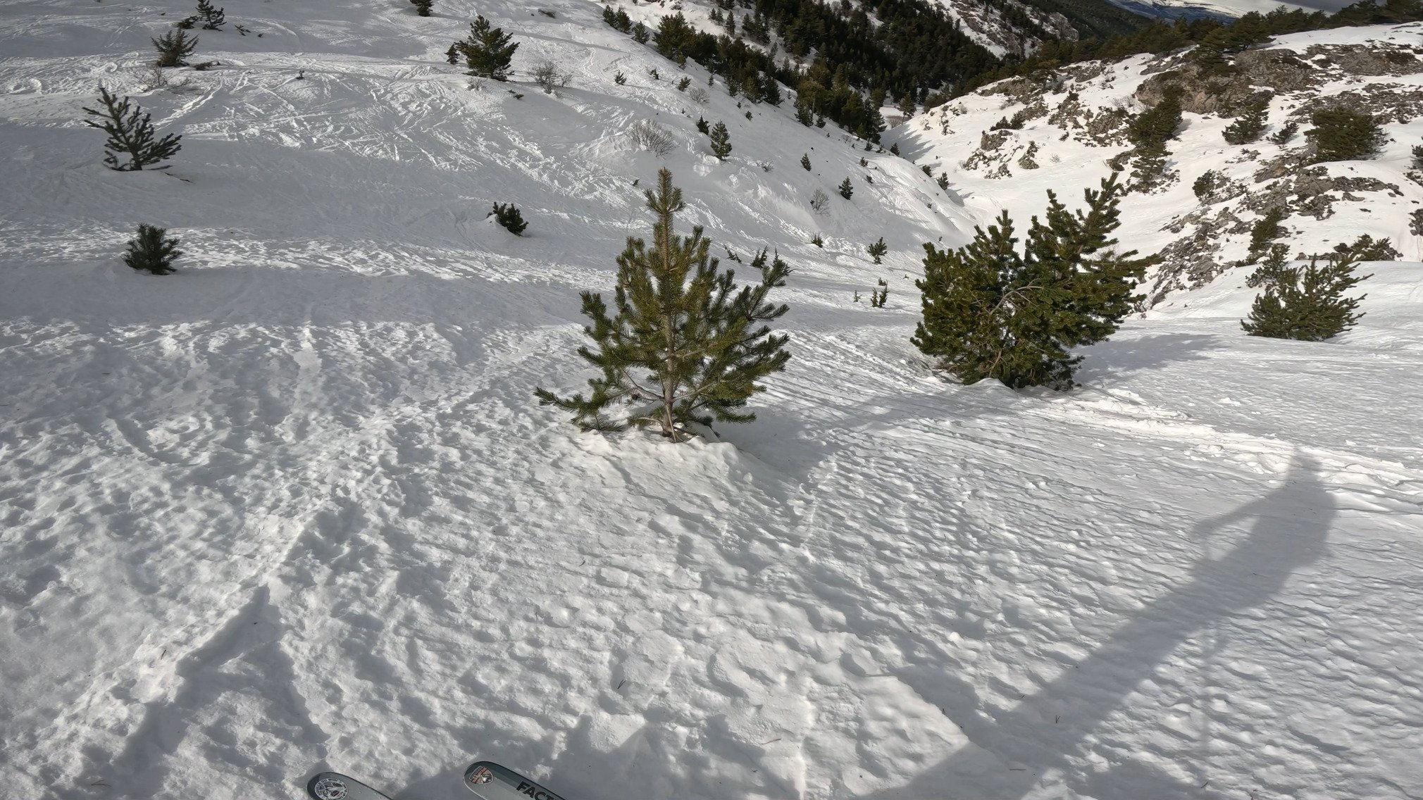 On reste sur de bonnes conditions même si les dernières chutes de neiges commencent à remonter. Neige dure et très travaillée par le vent qui s’adoucit vers 12h jusque finir en neige de printemps sur le bas. Forcément avec 6 degrés et le soleil de mi Février le manteau neigeux commence à fondre même s’il en reste énormément.
