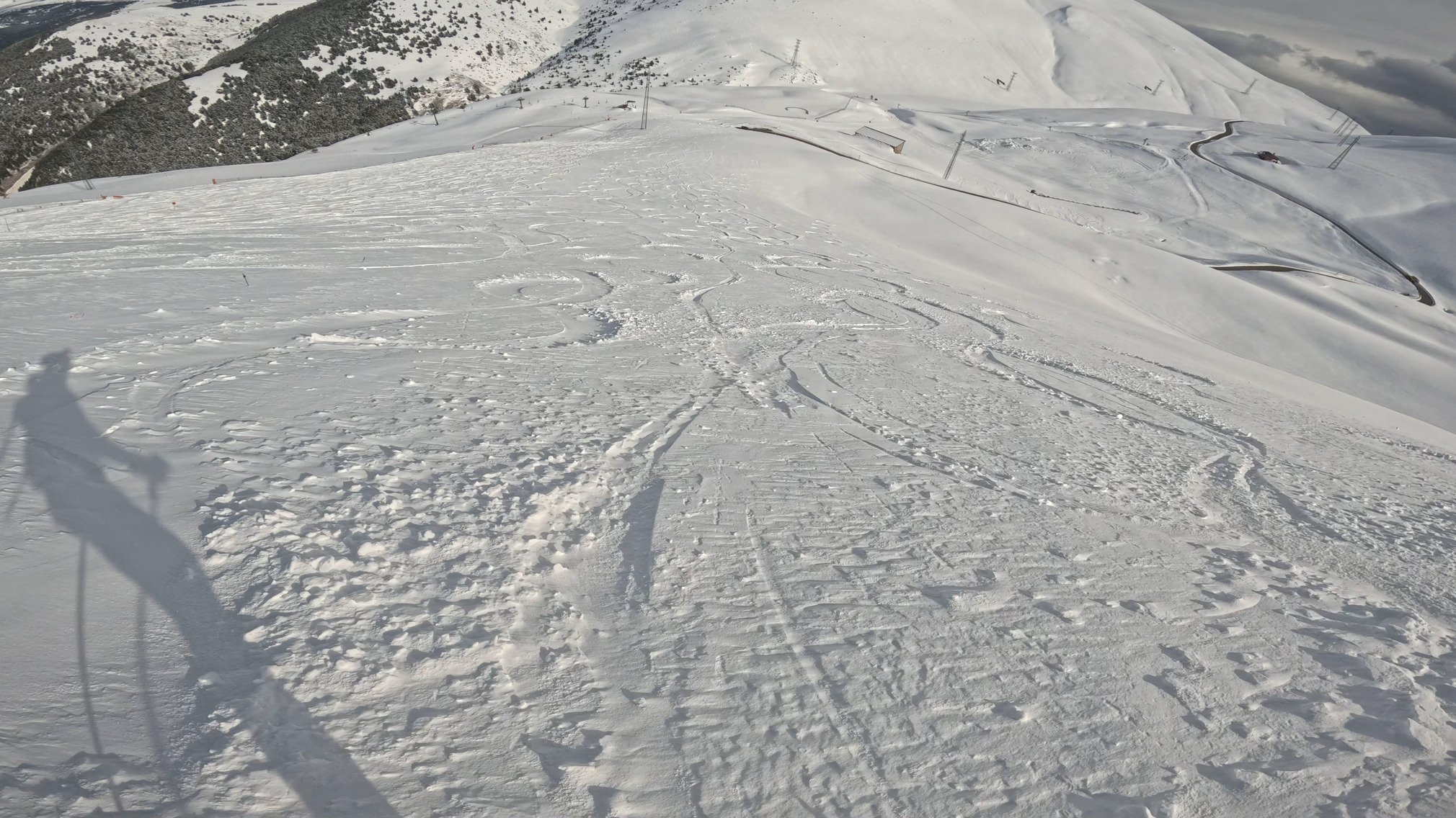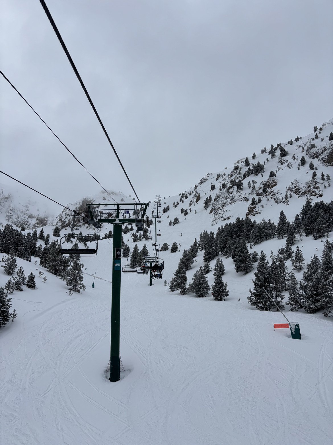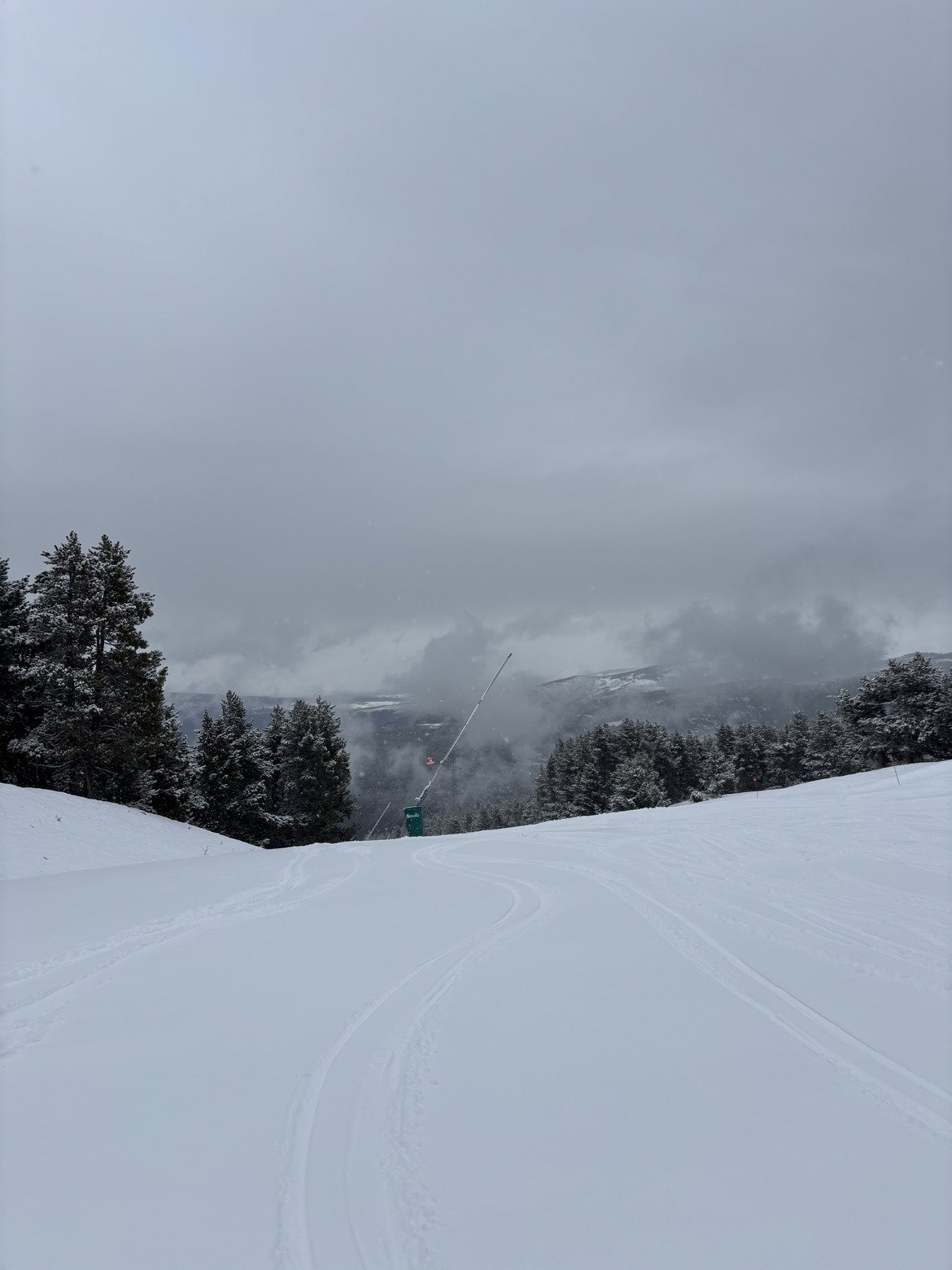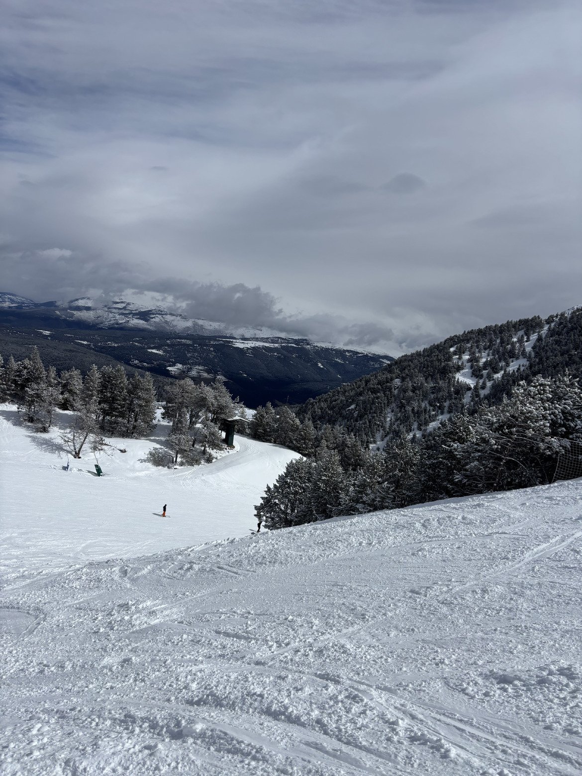 Une des meilleures journées de la saison dans ma station de proximité en Cerdagne côté Espagne. Environ 10 cm de neige fraîche au dessus de 2000m, très agréable à skier car le froid est de retour. Les sapins sont même blancs sur le front de neige, on se croirait en Janvier.