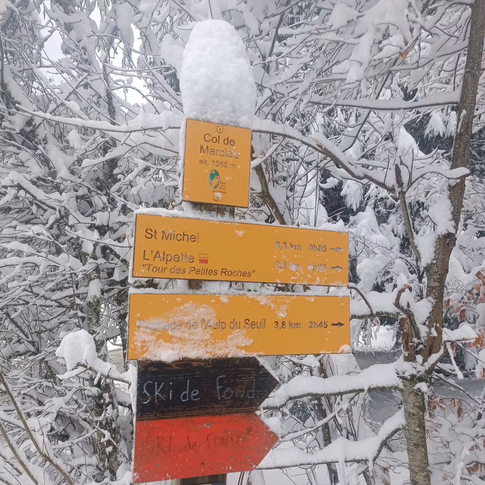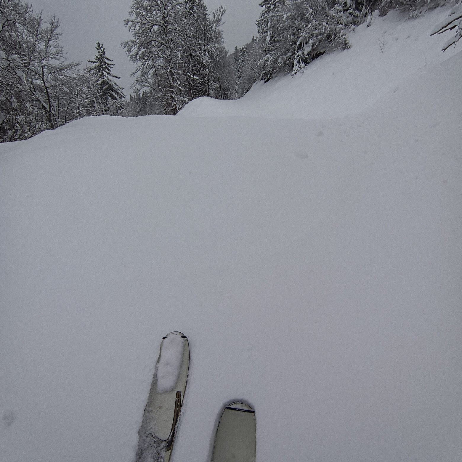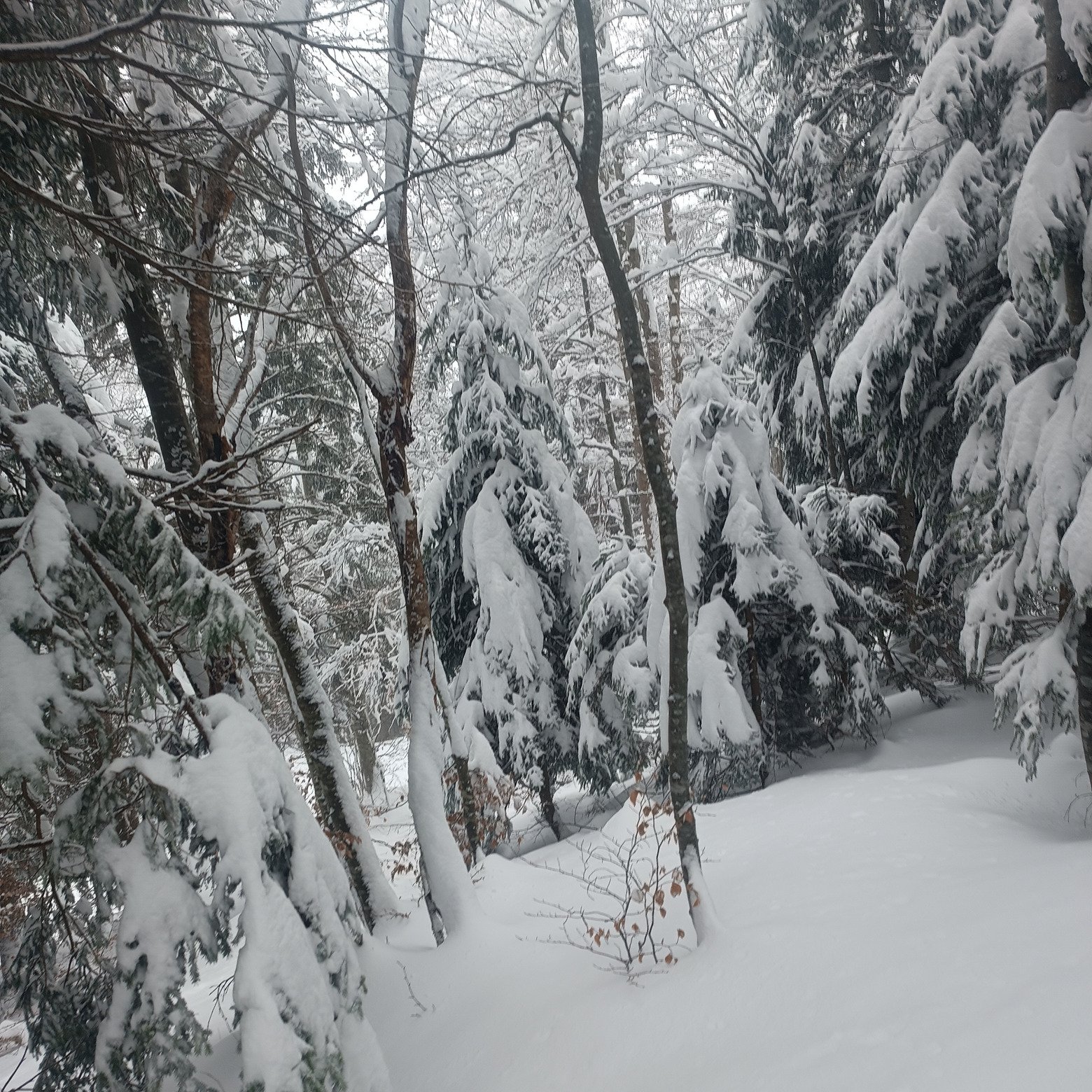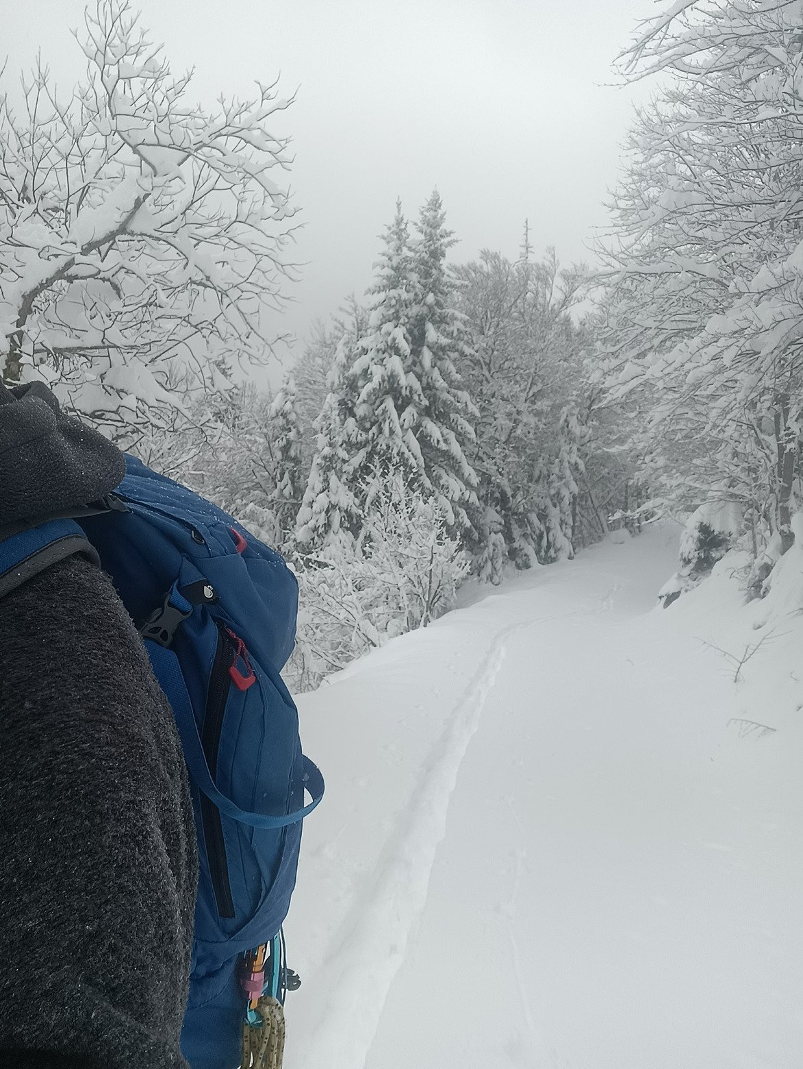 1 Trace devant moi me laisse espérer une arrivée rapide...plus rien ensuite à la sortie du teleski et je passe en mode tranchée pour aller sortir de la foret après l'ALpette (1600) sous l'aulp du seuil; dans cette seconde et longue partie de brassage la quantité de neige monte à 70 et j'entendrai un petit 'whoof' local