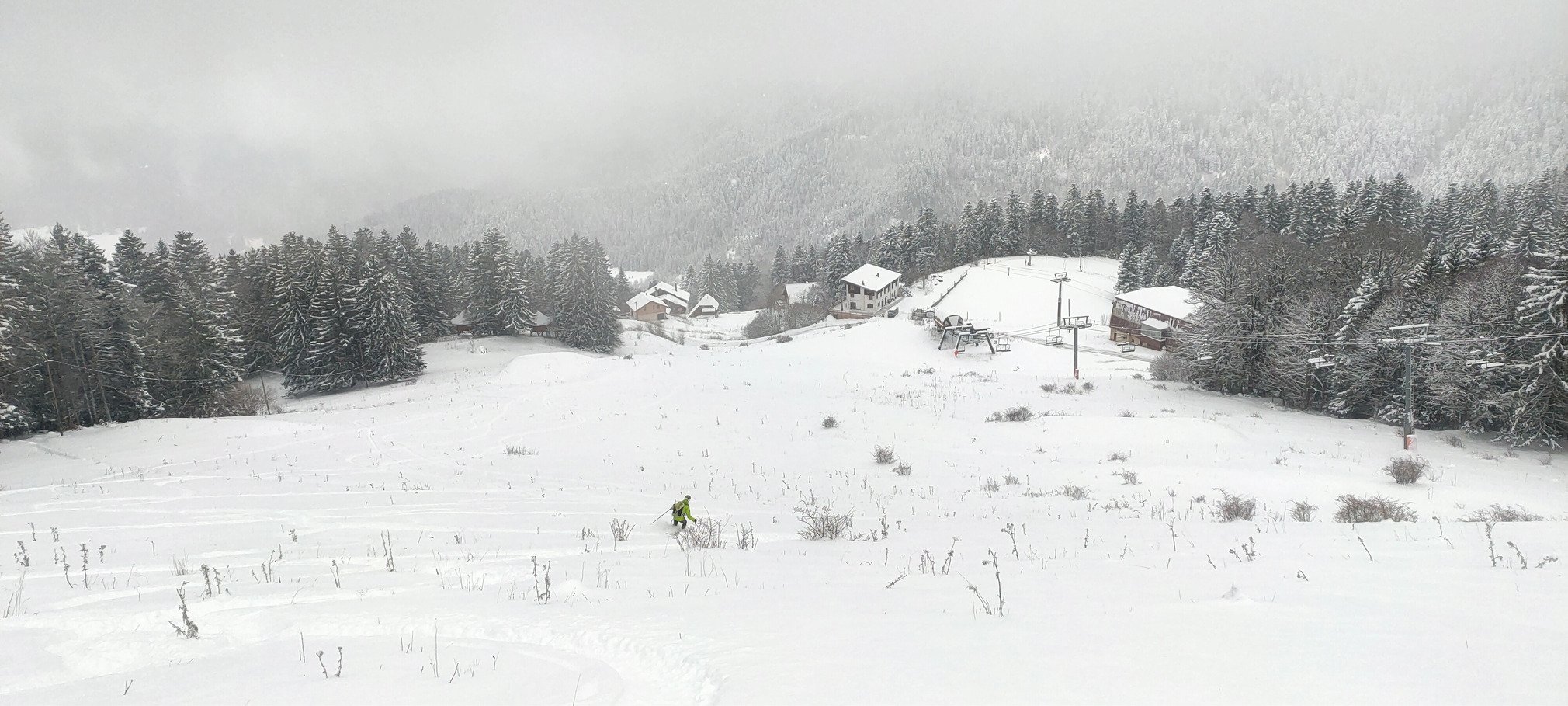 La vraie descente - par notre itinéraire de montée (anciennes pistes rouges du TS Scia et TC Les Essarts) - se révèle en revanche bien agréable. La poudre est hyper légère jusqu'au pied du TS Scia, un poil plus lourde en dessous (mais encore bien bonne). Après, on sent bien que ça manque de sous couche, mais grâce à une belle épaisseur (25-30 cm par endroits) on peut skier sans trop se poser de questions. Il faut juste être un minimum malin, éviter les parties trop raides et rester léger sur ses appuis. Au final, on s'en tire avec deux trois rayures sans conséquences.