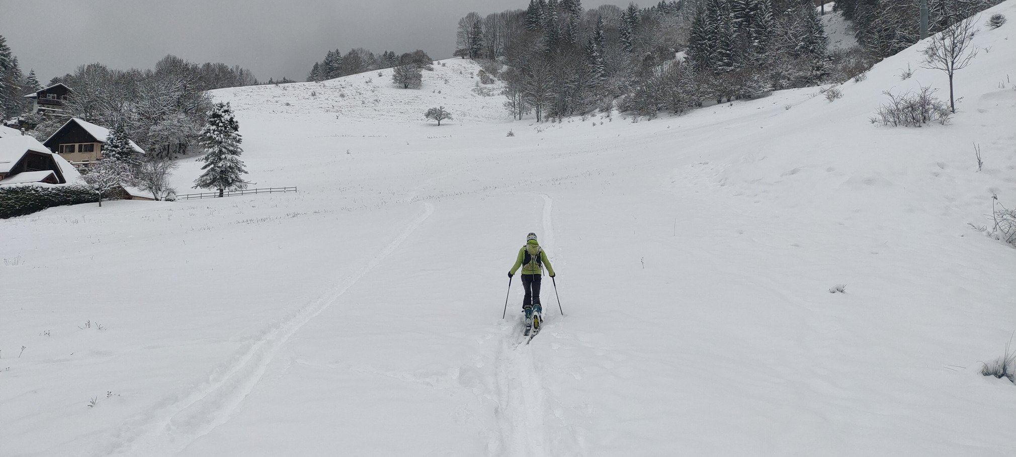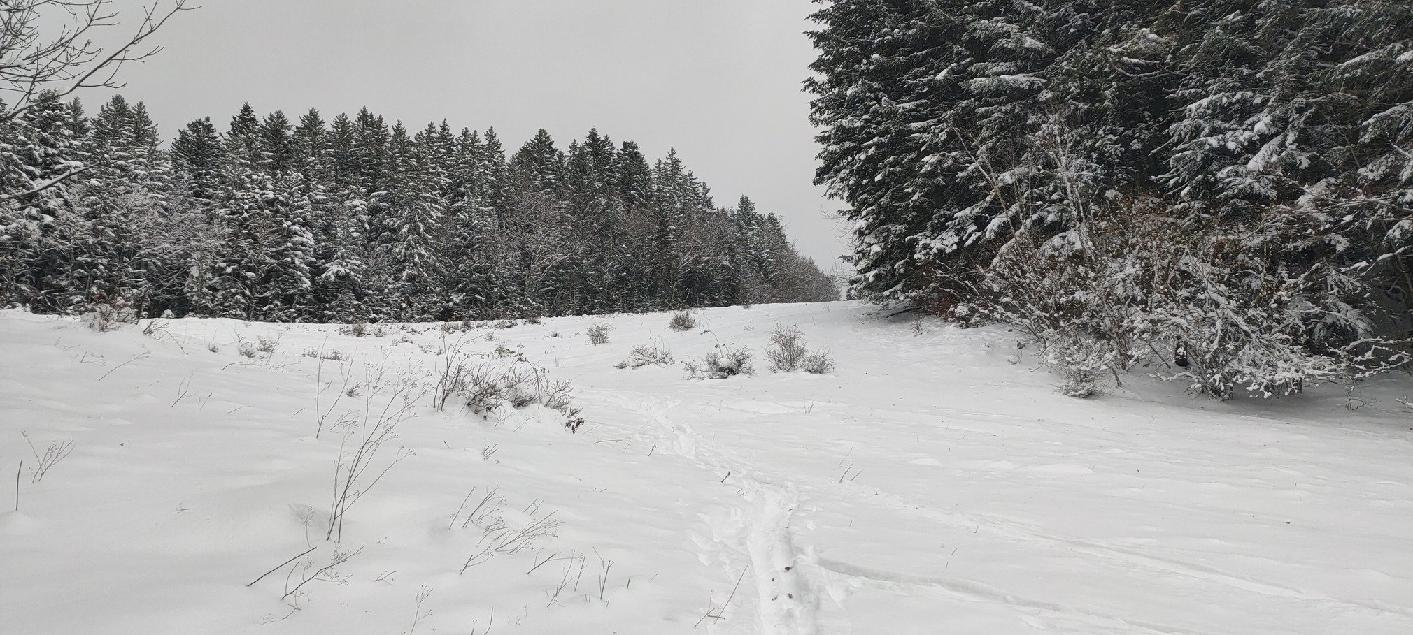 Direction la Scia en suivant la trace de nos prédécesseurs, dans une poudreuse bien légère. Au sommet, on tente une première descente vers la Combe de l'Ours. C'est dingue comme les vernes ont poussé depuis ma dernière venue ici il y a 2 ou 3 ans ! Après quatre (tentatives de) virages et des sccrrthhh sous la semelle, on se rend à l'évidence : c'est un vrai champ de mines ! On a beau avoir pris les skis cailloux, le plan n'est pas de les fusiller complètement ! On remonte rapidement skis sur le dos.