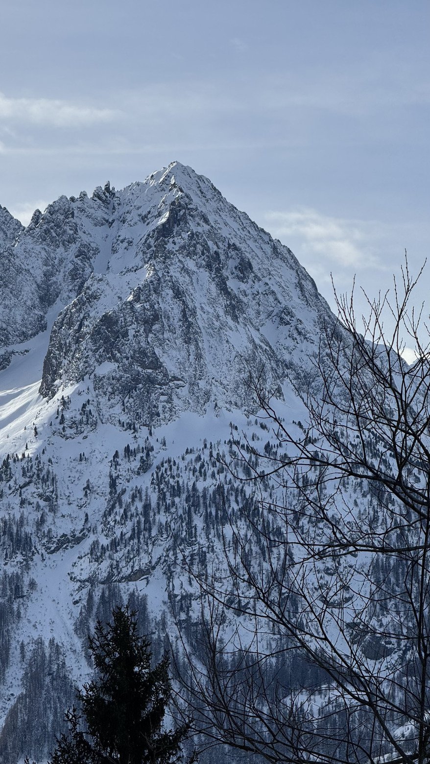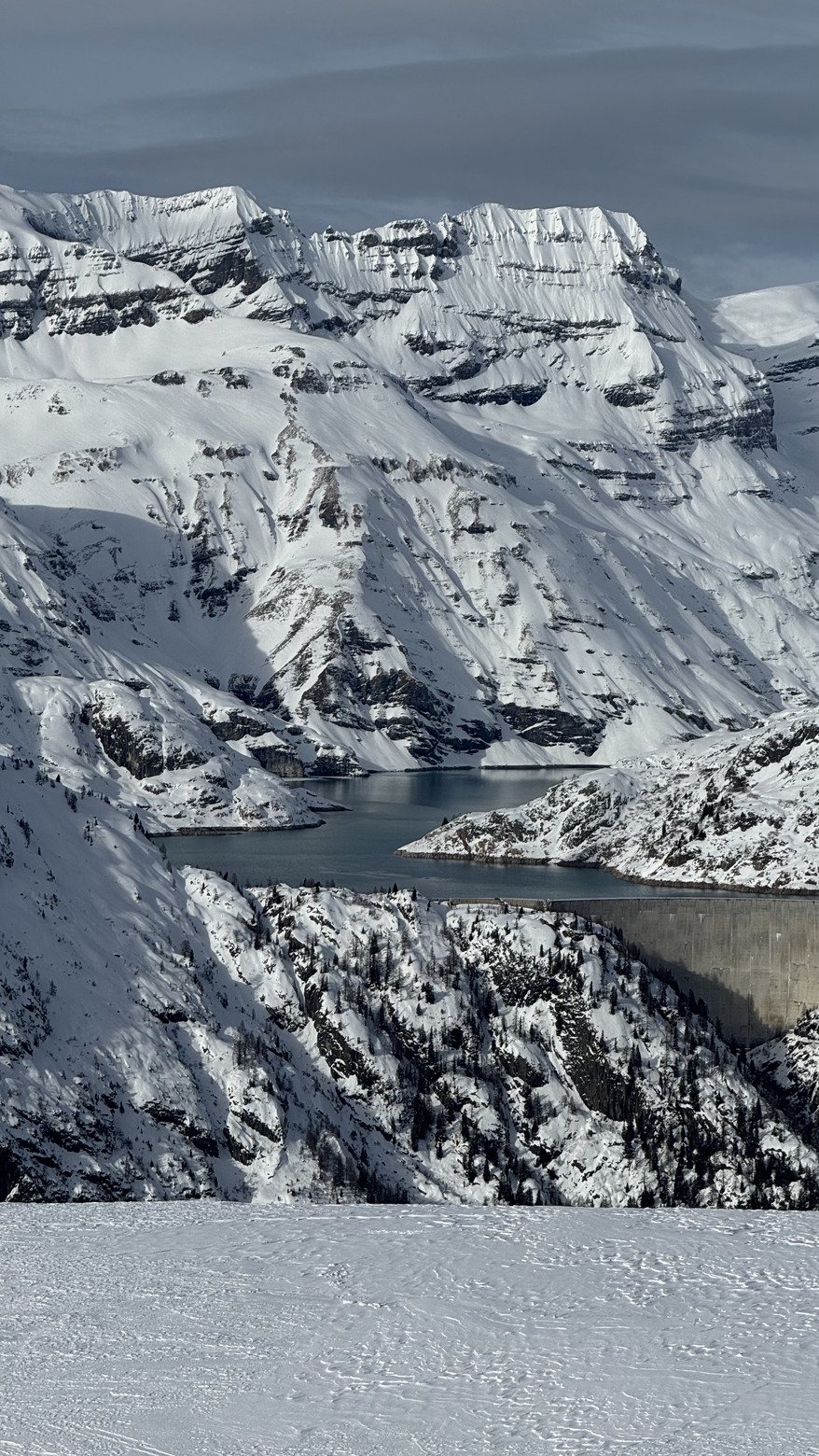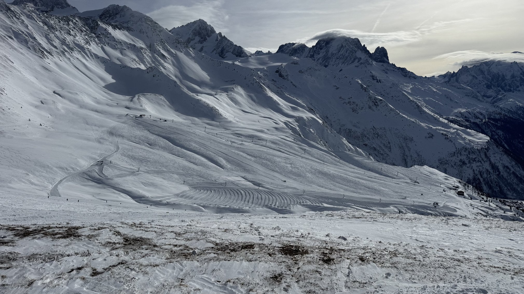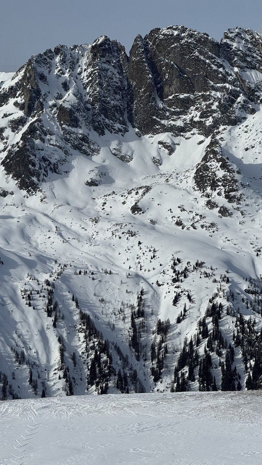 La magie d’hier a déjà disparu. Il a effectivement beaucoup soufflé sur le domaine, la neige est bien compactée et rien n’a résisté au vent sur les crêtes et sommets. Dans les pentes protégées du vent mais plus basse en altitude c’est la redoux qui a travaillé la neige, elle était déjà alourdis ce matin. Certaines pentes sont bien plaquées et on peut apercevoir une petite coulée déclenché en face (côté Loriaz)