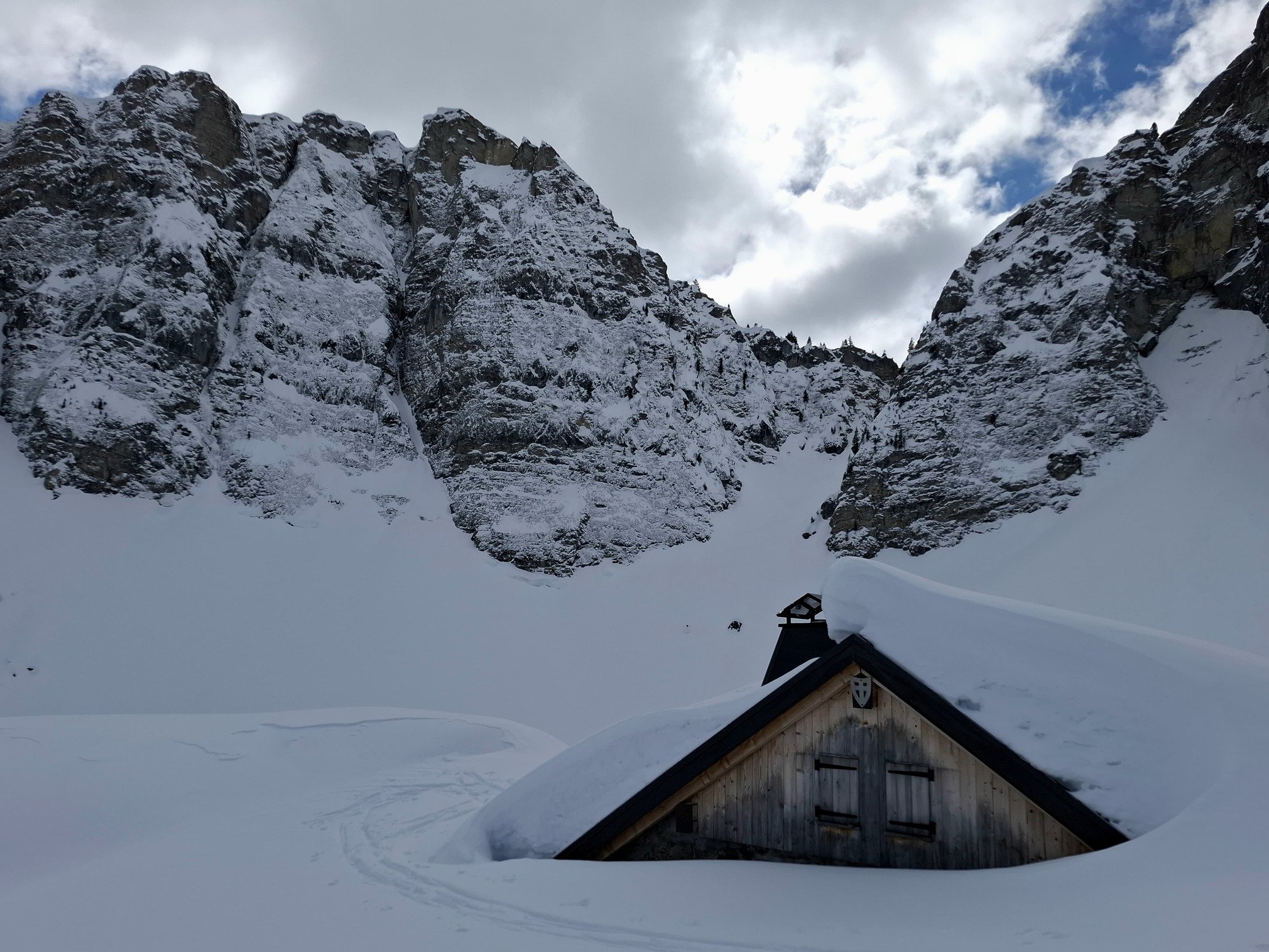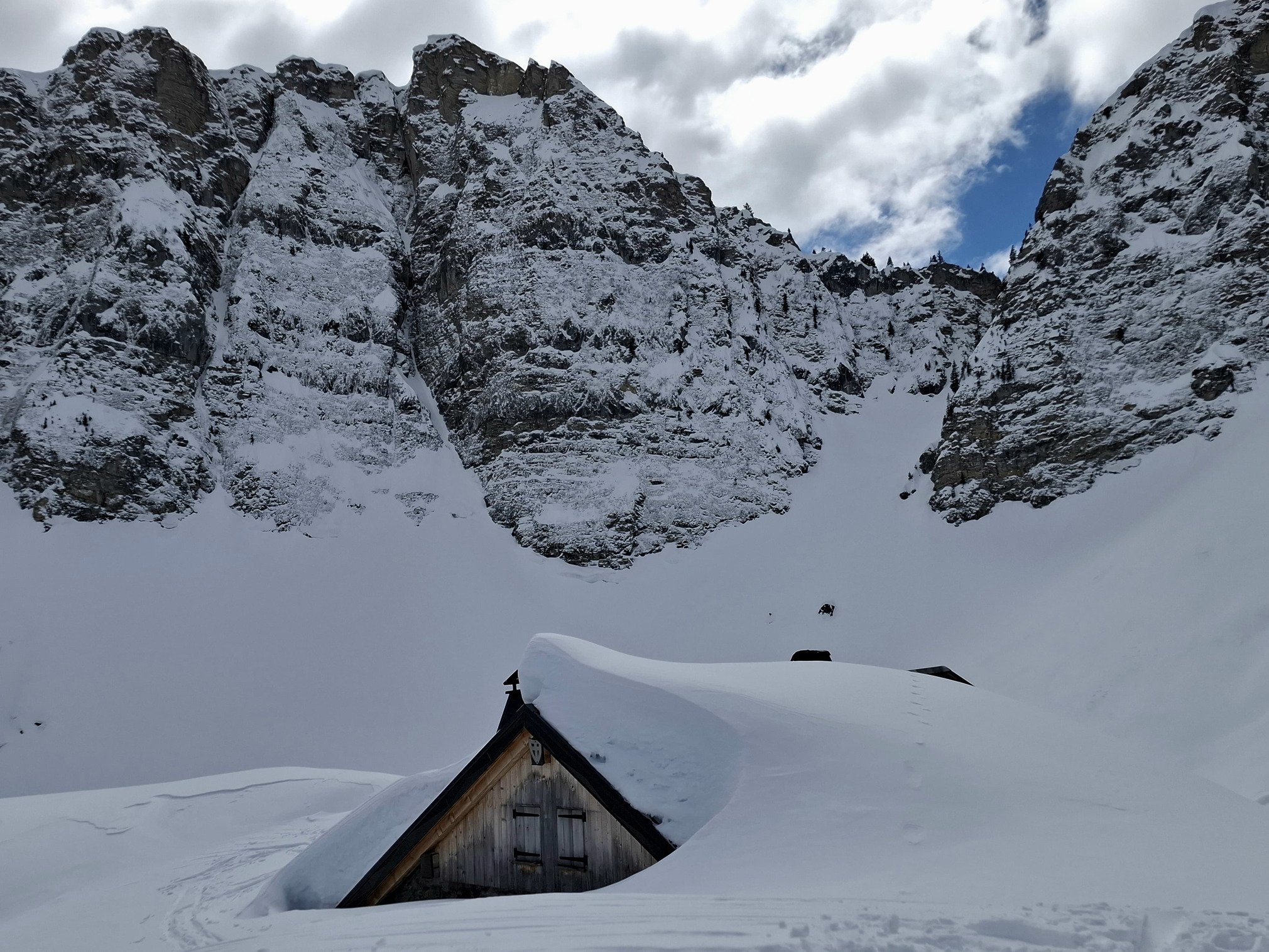 Comme d’habitude, il y a de belles ruptures de neige humide sur les faces sud-est en dessous des chalets. En montant, je repère une belle ligne sur cette face qui evite ces ruptures et qui n’avait pas encore de traces.