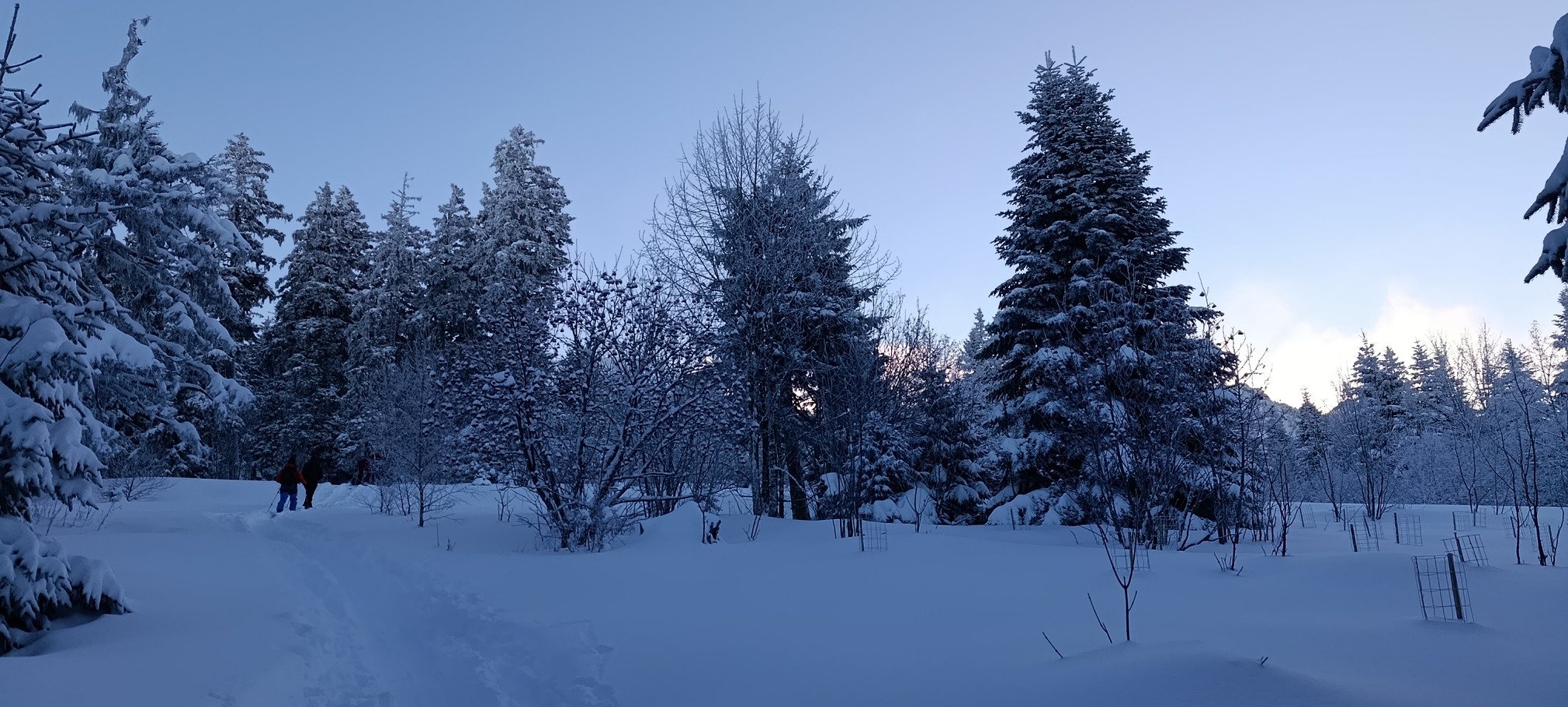 Il nous faut peu de temps pour nous préparer. Nous décollons (héliski version bon appétit) par -7° et avec le ciel bleu, droit dans la forêt. C'est juste magnifique. Les arbres sont chargés, les souches sont recouvertes, la trace serpente entre les arbres et sous les branches couverte de neige qui ne demande qu'à nous tomber dessus. Nous entendons de nombreux tires de mine sur le versant d'en face. Les pisteurs de la stations sont en plein travail.