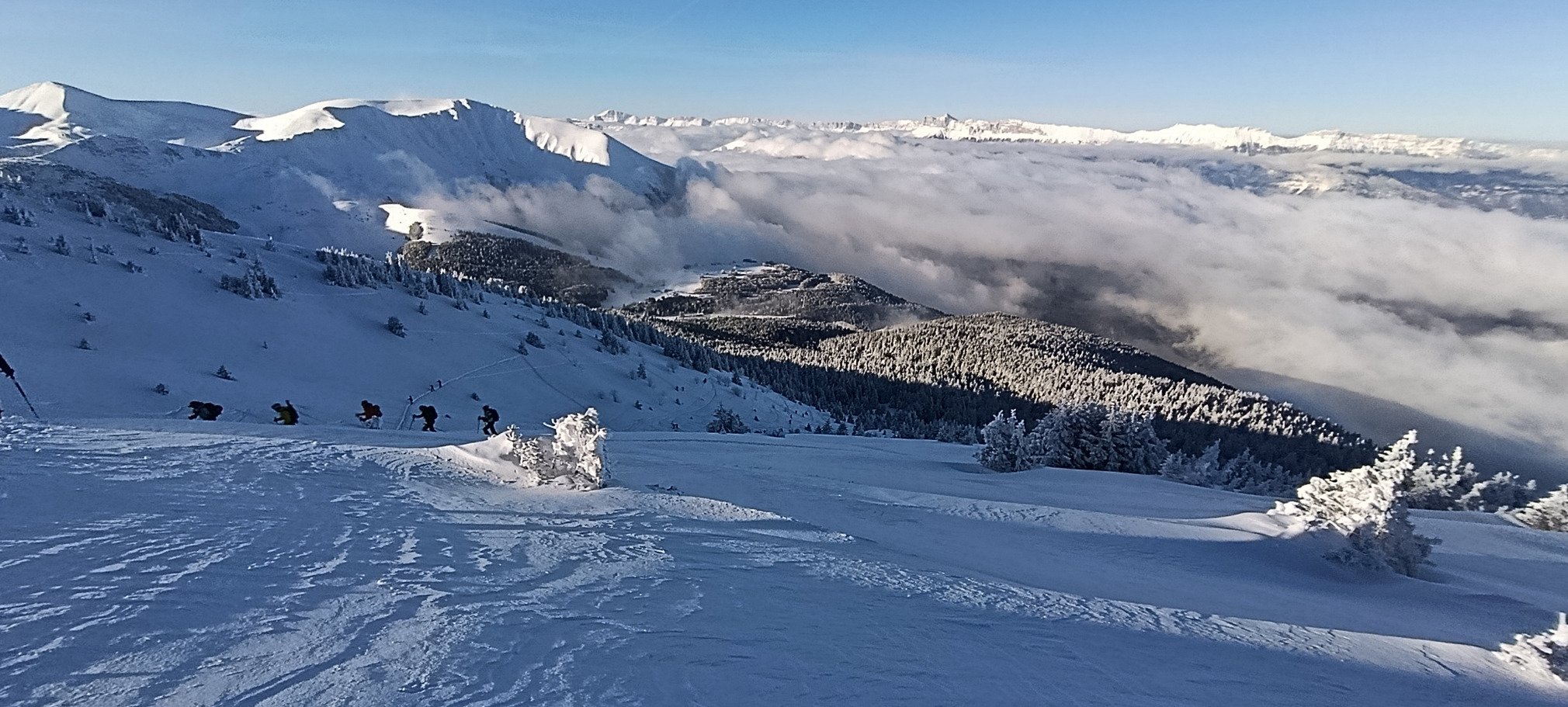 La montée est efficace jusqu'à la lisière. Là, la vue s'ouvre et le panorama s'étale en 16:9ième : Obiou, Vercors, Chartreuse... La partie la plus laide est cachée par la mer de nuage. Les champs de neige vierges et immaculés sont de toute beauté et font rêver pour la descente. Nous continuons à nous élever gentiment jusqu'à environ 2100 où le vent se fait sentir.