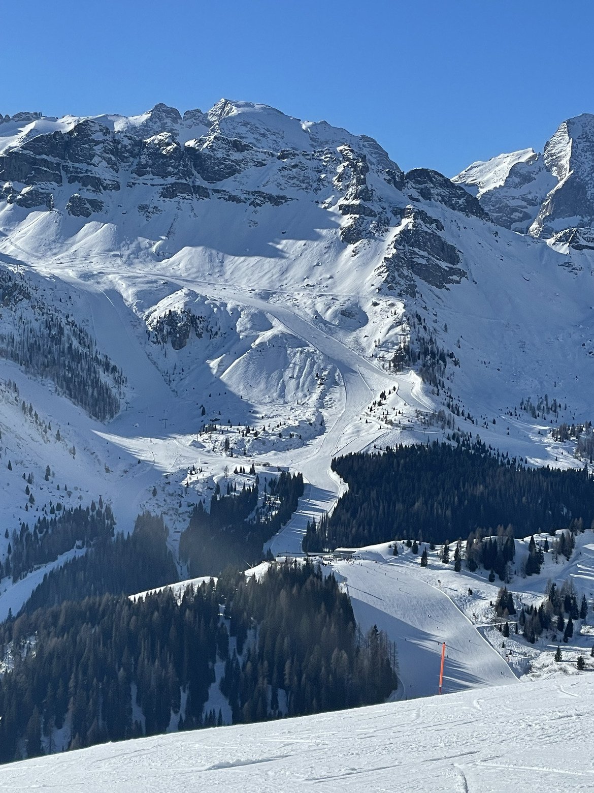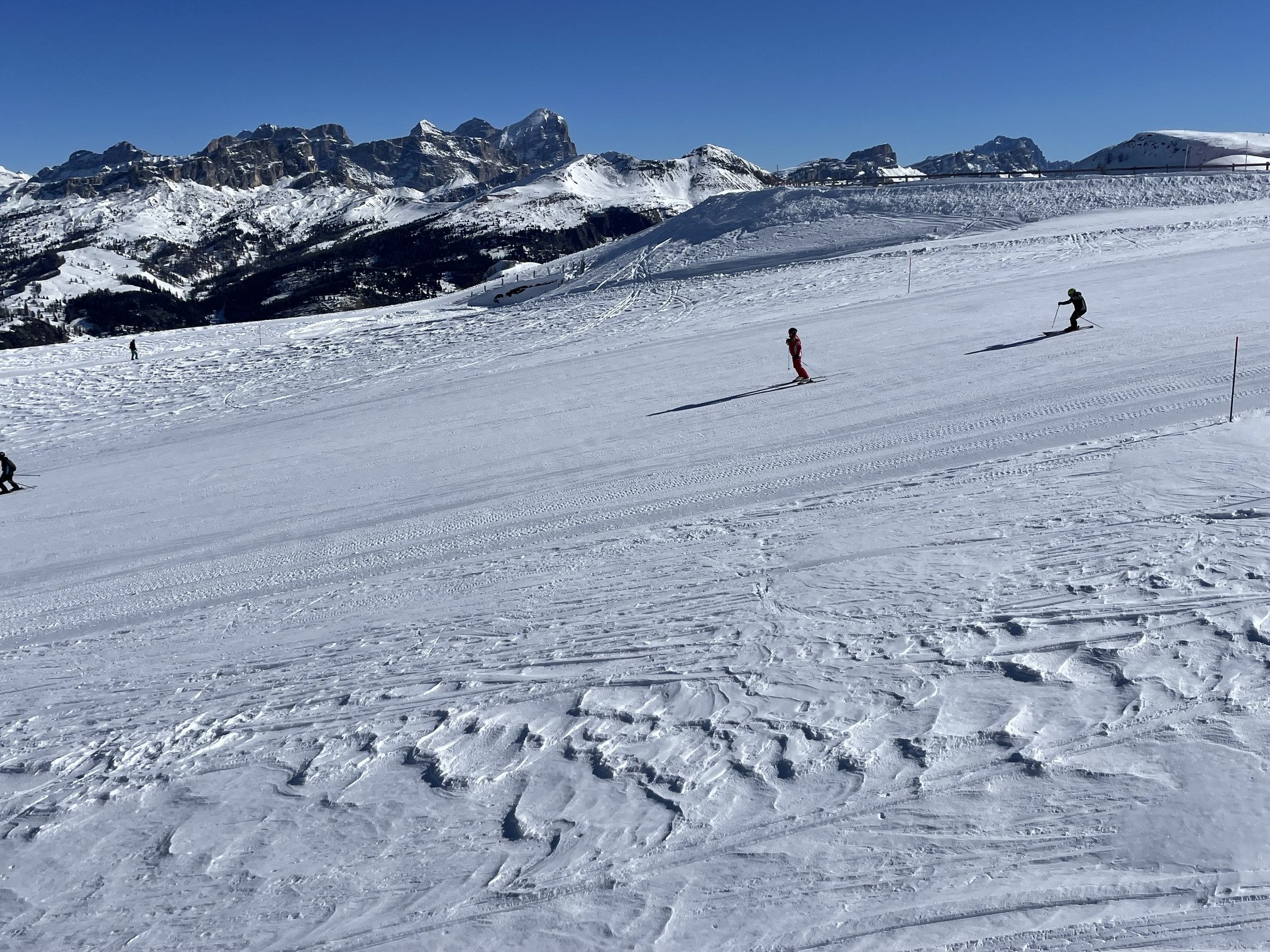 1 degré à Selva Di Gardena à 8h15, d’où nous partons pour faire la Sella Ronda en entier. Comme les jours précédents, j’ai trouvé la neige convenable (pas excellente mais pas franchement mauvaise car pas de verglas ni herbe ni caillou) jusqu’à 12h30 environ. Très bien coté Val di Frassa avec Arraba/Canazei.