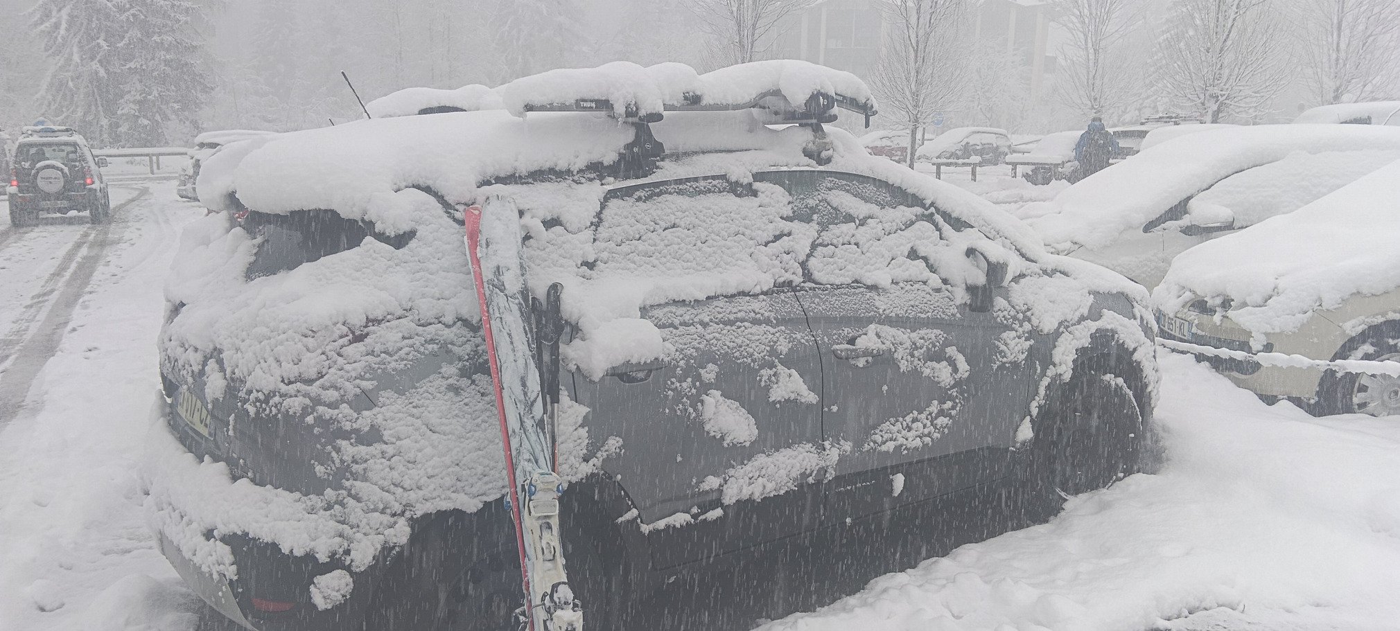 La suite de la journée sera du même acabit, d'autant qu'il a continué à neiger sans discontinuer. La photo de ma voiture sur le parking vers 17h donne une bonne idée de la quantité de fraîche qui s'est ajoutée pendant la journée.
