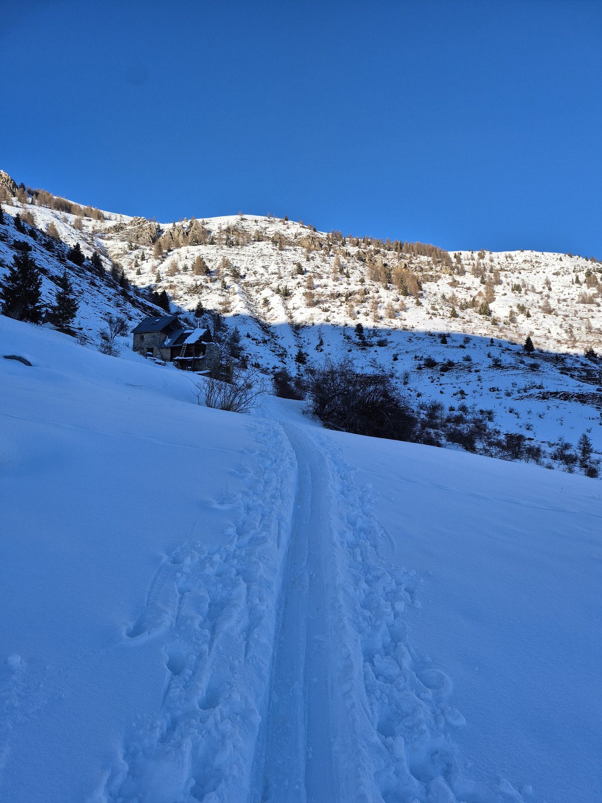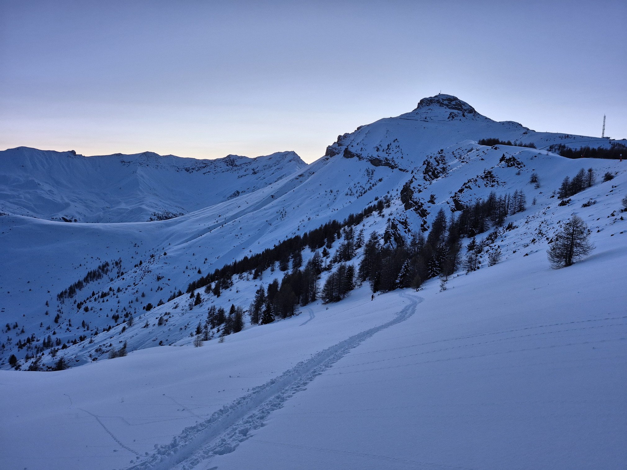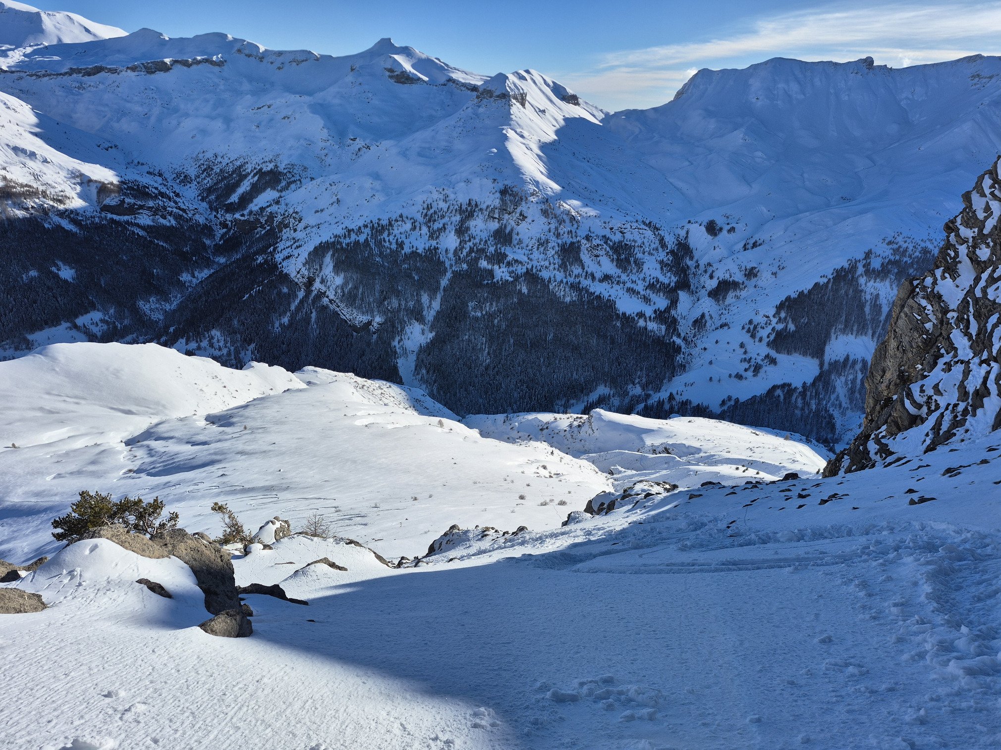 On a terminé la journée avec mon frère dans un hors piste qui sort complètement du domaine, du coup juste 2 autres traces, mais en face sud c’était bien mauvais en haut (2400-2200), cailloux et neige hyper lourde. Plus bas c’était bien sympa. A 1800m on met les peaux et retour vers la civilisation, on est rentré a 18h30...