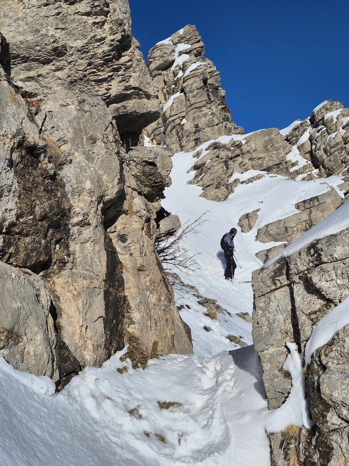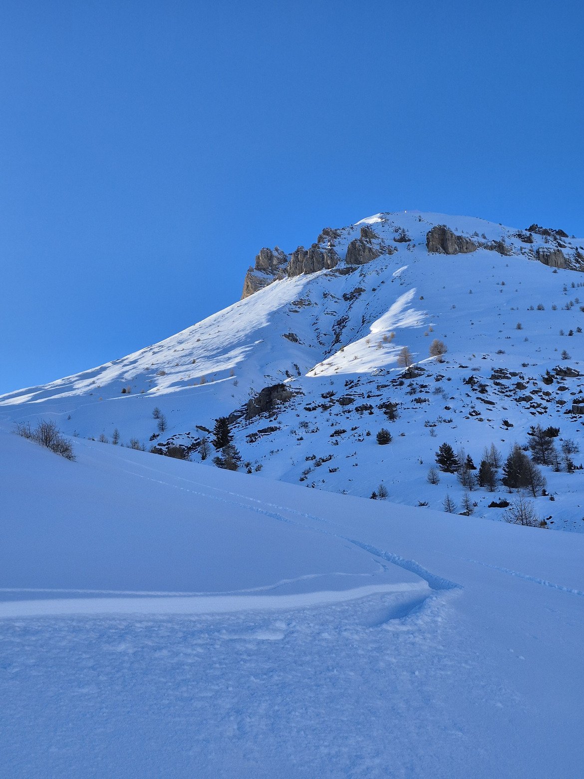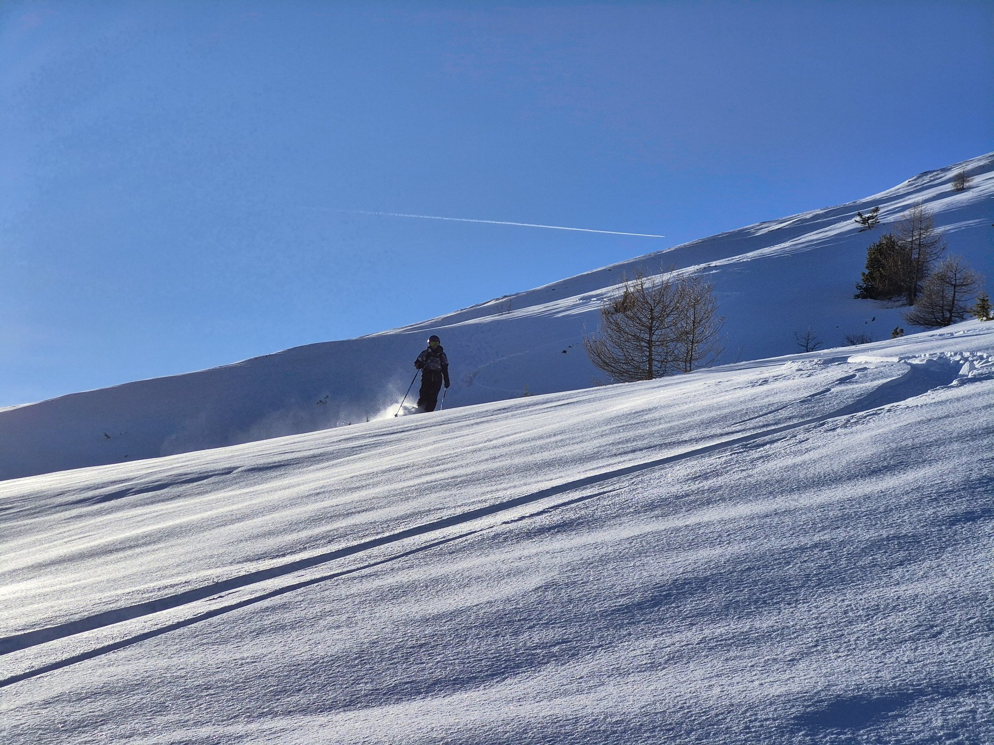 On a terminé la journée avec mon frère dans un hors piste qui sort complètement du domaine, du coup juste 2 autres traces, mais en face sud c’était bien mauvais en haut (2400-2200), cailloux et neige hyper lourde. Plus bas c’était bien sympa. A 1800m on met les peaux et retour vers la civilisation, on est rentré a 18h30...